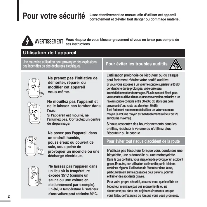 Pour votre sécurité AVERTISSEMENT WARNING Lisez attentivement ce manuel afin d'utiliser cet appareil correctement et d'éviter tout danger ou dommage matériel. Vous risquez de vous blesser gravement si vous ne tenez pas compte de ces instructions. Utilisation de l'appareil Une mauvaise utilisation peut provoquer des explosions, des incendies ou des décharges électriques. Ne prenez pas l'initiative de démonter, réparer ou modifier cet appareil vous-même. Ne mouillez pas l'appareil et ne le laissez pas tomber dans l'eau. Si l'appareil est mouillé, ne l'allumez pas. Contactez un centre de dépannage. Ne posez pas l'appareil dans un endroit humide, poussiéreux ou couvert de suie, sous peine de provoquer un incendie ou une décharge électrique. Ne laissez pas l'appareil dans un lieu où la température excède 35°C (comme un sauna ou une voiture en stationnement par exemple).