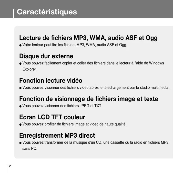Votre lecteur peut lire les fichiers MP3, WMA, audio ASF et Ogg. Disque dur externe