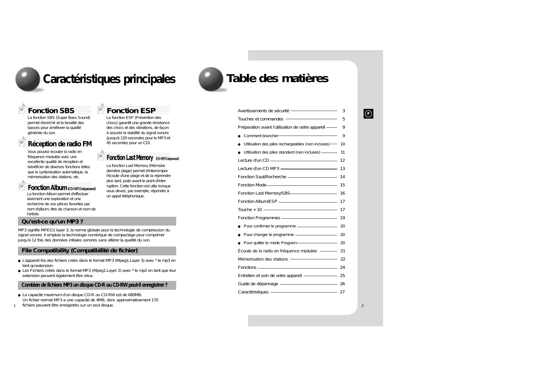 Réception de radio FM Vous pouvez écouter la radio en fréquence modulée avec une excellente qualité de réception et bénéficier de diverses fonctions telles que la syntonisation automatique, la mémorisation des stations, etc. Fonction Album (CD-MP3 Uniquement) La fonction Album permet d'effectuer aisément une exploration et une recherche de vos pièces favorites par nom d'album, titre de chanson et nom de l'artiste. Fonction Last Memory (CD-MP3 Uniquement) La fonction Last Memory (Mémoire dernière plage) permet d'interrompre l'écoute d'une plage et de la reprendre plus tard, juste avant le point d'interruption. Cette fonction est utile lorsque vous devez, par exemple, répondre à un appel téléphonique. Qu’est-ce qu’un MP3 ? MP3 signifie MPEG1 layer 3, la norme globale pour la technologie de compression du signal sonore. Il emploie la technologie numérique de compactage pour comprimer jusqu’à 12 fois des données initiales sonores sans altérer la qualité du son.
