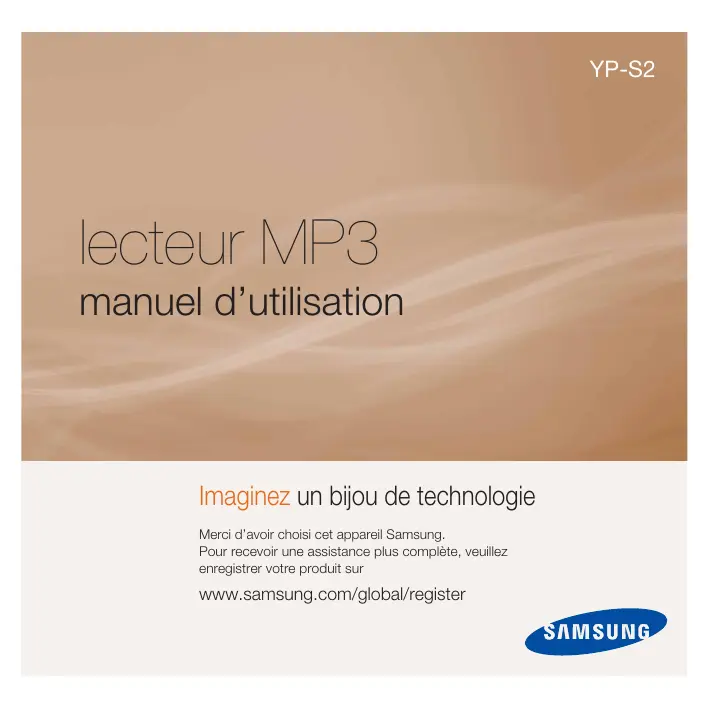 YP-S2 lecteur MP3 manuel d’utilisation Imaginez un bijou de technologie Merci d’avoir choisi cet appareil Samsung. Pour recevoir une assistance plus complète, veuillez enregistrer votre produit sur www.samsung.com/global/register fonctionnalités de votre nouveau lecteur MP3 Elégant, intelligent, fiable et très pratique : votre nouveau lecteur MP3 est tout cela à la fois et plus encore. Grâce à sa forme compacte, il se glisse facilement dans votre poche. Vous ne pourrez plus vous passer de votre nouveau lecteur MP3, que ce soit pour pratiquer une activité physique ou télécharger vos chansons préférées. Utilisez-le ne serait-ce qu’une seule fois et vous vous demanderez comment vous avez pu vivre sans.