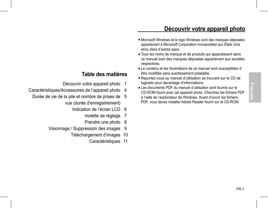 FR- Français Découvrir votre appareil photo Caractéristiques/Accessoires de l’appareil photo Durée de vie de la pile et nombre de prises de vue (durée d’enregistrement) Indication de l’écran LCD molette de réglage Prendre une photo Visionnage / Suppression des images Téléchargement d’images Caractéristiques å Microsoft Windows et le logo Windows sont des marques déposées appartenant à Microsoft Corporation incorporated aux États Unis et/ou dans d’autres pays. å Tous les noms de marque et de produits qui apparaissent dans ce manuel sont des marques déposées appartenant aux sociétés respectives. å Le contenu et les illustrations de ce manuel sont susceptibles d’ être modifiés sans avertissement préalable. å Reportez-vous au manuel d’utilisation se trouvant sur le CD de logiciels pour davantage d’informations. å Les documents PDF du manuel d’utilisation sont fournis sur le CD-ROM fourni avec cet appareil photo. Cherchez les fichiers PDF à l’aide de l’explorateur de Windows. Avant d’ouvrir les fichiers PDF, vous devez installer Adobe Reader fourni sur le CD-ROM. Découvrir votre appareil photo DANGER AVERTISSEMENT Le symbole «DANGER» avertit d’un danger imminent qui, si vous ne suivez pas les consignes de sécurité, peut entraîner des blessures graves, voire mortelles. Le symbole «AVERTISSEMENT» indique un danger éventuel qui, si vous ne suivez pas les consignes de sécurité, peut entraîner des blessures graves, voire mortelles. N’essayez pas de faire une quelconque modification sur votre appareil photo. Toute modification pourrait causer un choc électrique, un incendie, des blessures corporelles ou des dommages à l’appareil photo. L’inspection interne de l’appareil, l’entretien et les réparations doivent être uniquement réalisées par votre revendeur ou le Centre de service après-vente de Samsung. Si un liquide ou un objet pénètre dans l’appareil, prenez garde de ne pas utiliser ce dernier. Éteignez l’appareil photo, puis coupez l’alimentation (piles ou adaptateur secteur). Prenez contact avec votre revendeur ou le Centre de service après-vente de Samsung. D’ici là, n’utilisez en aucun cas l’ appareil pour éviter tout incendie et toute électrocution. Pour des raisons de sécurité, rangez cet appareil et ses accessoires dans un endroit hors de la portée des enfants et des animaux afin de prévenir tout accident et notamment: -Ingestion des piles ou des petits accessoires de l’appareil photo. En cas d’accident, veuillez consulter un médecin immédiatement. -Les pièces mobiles de l’appareil photo peuvent provoquer des blessures. Veillez à ne pas utiliser cet appareil à proximité de produits inflammables ou de gaz explosifs, car cela pourrait augmenter les risques d’explosion. Il se peut que la pile et l’appareil chauffent lors d’une utilisation prolongée. Cela peut provoquer un mauvais fonctionnement de l’appareil. Si cela devait se produire, laissez l’appareil au repos quelques minutes afin qu’il refroidisse. N’insérez pas et ne laissez pas tomber d’objets métalliques ou inflammables dans l’appareil photo par les points d’accès, par exemple le logement de la carte mémoire et le compartiment de piles. Cela peut provoquer un incendie ou un choc électrique. Ne laissez pas cet appareil dans des endroits très chauds, tels que les véhicules fermés, en exposition à la lumière directe du soleil ou exposés à des variations extrêmes de température. L’ exposition à des températures extrêmes risque d’endommager les composants internes de l’appareil photo et provoquer un incendie. Ne manipulez pas cet appareil avec des mains humides. Cela pourrait causer un incendie ou un choc électrique. FR- N’utilisez pas le flash à proximité des personnes ni des animaux. Le positionnement du flash trop près des yeux du sujet peut causer des dommages à la vue. En cours d’utilisation, ne couvrez pas l’appareil photo ou le chargeur. Cela risque de provoquer un réchauffement et la déformation du boîtier ou provoquer un incendie. Utilisez toujours votre appareil photo et ses accessoires dans un endroit bien ventilé. Découvrir votre appareil photo