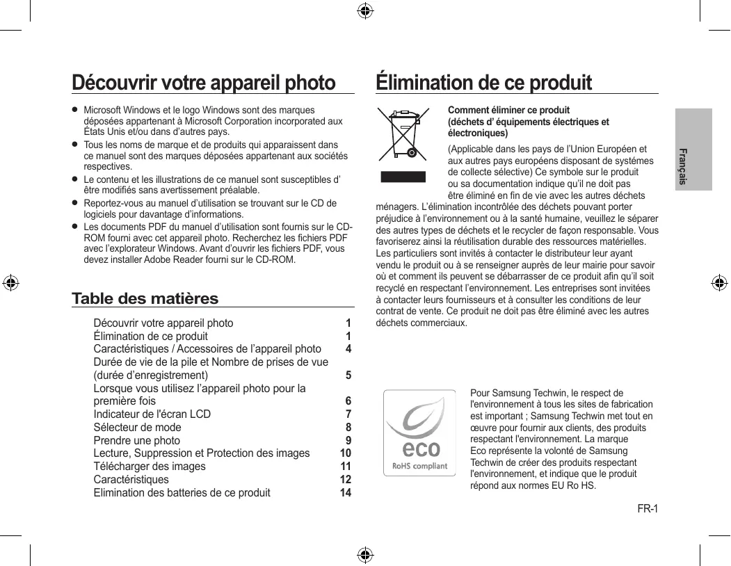 Table des matières Découvrir votre appareil photo Élimination de ce produit Caractéristiques / Accessoires de l’appareil photo Durée de vie de la pile et Nombre de prises de vue (durée d’enregistrement) Lorsque vous utilisez l’appareil photo pour la première fois Indicateur de l'écran LCD Sélecteur de mode Prendre une photo Lecture, Suppression et Protection des images Télécharger des images Caractéristiques Elimination des batteries de ce produit