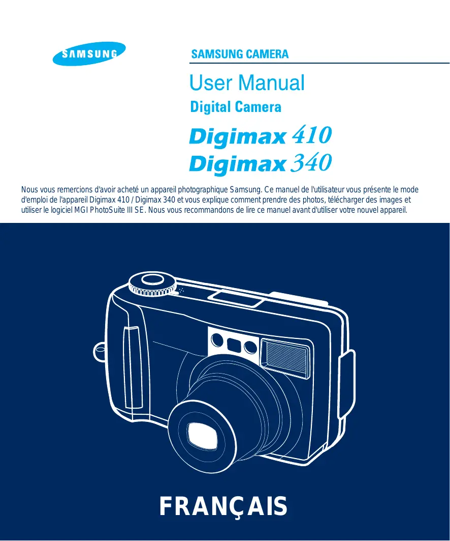 Nous vous remercions d'avoir acheté un appareil photographique Samsung. Ce manuel de l'utilisateur vous présente le mode d'emploi de l'appareil Digimax 410 / Digimax 340 et vous explique comment prendre des photos, télécharger des images et utiliser le logiciel MGI PhotoSuite III SE. Nous vous recommandons de lire ce manuel avant d'utiliser votre nouvel appareil.
