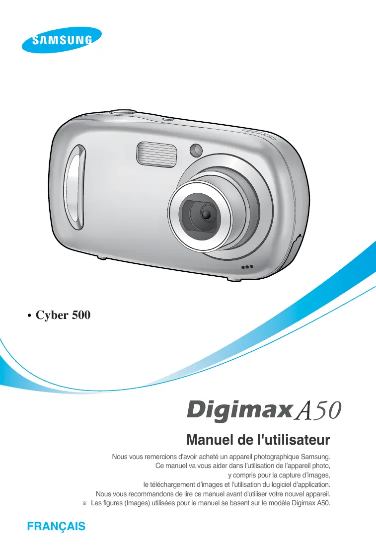 ҮCyber 500 Manuel de l'utilisateur Nous vous remercions d'avoir acheté un appareil photographique Samsung. Ce manuel va vous aider dans l’utilisation de l’appareil photo, y compris pour la capture d’images, le téléchargement d’images et l’utilisation du logiciel d’application. Nous vous recommandons de lire ce manuel avant d'utiliser votre nouvel appareil. ſ Les figures (Images) utilisées pour le manuel se basent sur le modèle Digimax A50. FRANÇAIS Instructions ƈ Pour utiliser votre appareil photo, veuillez vous reporter, dans l’ordre, aux sections énumérées ci-dessous: Installation du pilote de l’appareil photo Avant de brancher l’appareil à un PC, grâce au câble USB, vous devez d’abord paramétrer le pilote de l’appareil. Installez le pilote qui vous est fourni sur le CD-ROM de l’application logicielle. (p. 104) Prise de vue (p. 19) Prise de vue Branchement du câble USB Mise sous tension Utilisation du [disque amovible] Branchez le câble USB fourni avec l’appareil sur le port de connexion USB de ce dernier et le port USB du PC. (p. 112) Mise sous tension. Si l’appareil est éteint, appuyez sur la touche pour l’allumer. Ouvrez l’EXPLORATEUR de Windows et repérez le disque amovible.(p. 113) ƃ Si vous utilisez un lecteur de carte pour copier les images de la carte mémoire sur votre PC, les images risquent d’être endommagées. Lorsque vous transférez les images prises avec l’appareil photo sur votre PC, assurez-vous d’utiliser le câble USB fourni pour brancher l’appareil photo à votre PC. Sachez que le fabricant n’est pas responsable des pertes ou des dommages des images de la carte mémoire en cas d’utilisation d’un lecteur de carte.