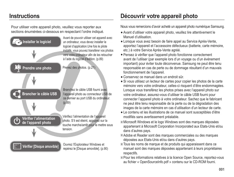ES70/ES71 User Manual Instructions Découvrir votre appareil photo Pour utiliser votre appareil photo, veuillez vous reporter aux sections énumérées ci-dessous en respectant l’ordre indiqué. Installer le logiciel Prendre une photo Brancher le câble USB Vérifier l’alimentation de l’appareil photo Vérifier [Disque amovible] Avant de pouvoir utiliser cet appareil avec un ordinateur, vous devez installer le logiciel d’application.Une fois le pilote installé, vous pouvez transférer vos photos vers votre ordinateur afin de les retoucher à l’aide du logiciel d’édition. (p.89) Prenez des photos. (p.21) Branchez le câble USB fourni avec l’appareil photo au connecteur USB de ce dernier au port USB du ordinateur. (p.89) Vérifiez l’alimentation de l’appareil photo. S’il est éteint, appuyez sur la touche marche/arrêt pour le mettre sous tension. Ouvrez l’Explorateur Windows et repérez le [Disque amovible]. (p.90) Nous vous remercions d’avoir acheté un appareil photo numérique Samsung. Avant d’utiliser votre appareil photo, veuillez lire attentivement le Manuel d’utilisation. Lorsque vous avez besoin de faire appel au Service Après-Vente, apportez l’appareil et l’accessoire défectueux (batterie, carte mémoire, etc.) à votre Service Après-Vente agréé. Pensez à vérifier que l’appareil photo fonctionne correctement avant de l’utiliser (par exemple lors d’un voyage ou d’un événement important) pour éviter toute déconvenue. Samsung ne peut être tenu responsable en cas de perte ou de dommage résultant d’un mauvais fonctionnement de l’appareil. Conservez ce manuel dans un endroit sûr. Si vous utilisez un lecteur de cartes pour copier les photos de la carte mémoire vers votre ordinateur, celles-ci risquent d’être endommagées. Lorsque vous transférez les photos prises avec l’appareil photo sur votre ordinateur, assurez-vous d’utiliser le câble USB fourni pour connecter l’appareil photo à votre ordinateur. Sachez que le fabricant ne peut être tenu responsable de la perte ou de la dégradation des images de la carte mémoire en cas d’utilisation d’un lecteur de carte. Le contenu et les illustrations de ce manuel sont susceptibles d’être modifiés sans avertissement préalable. Ä Microsoft Windows et le logo Windows sont des marques déposées appartenant à Microsoft Corporation Incorporated aux Etats-Unis et/ou dans d’autres pays. Ä Adobe et Reader sont des marques commerciales ou des marques déposées aux Etats-Unis et/ou dans d’autres pays. Ä Tous les noms de marque et de produits qui apparaissent dans ce manuel sont des marques déposées appartenant à leurs propriétaires respectifs. Ä Pour les informations relatives à la licence Open Source, reportez-vous au fichier « OpenSourceInfo.pdf » contenu sur le CD-ROM fourni.