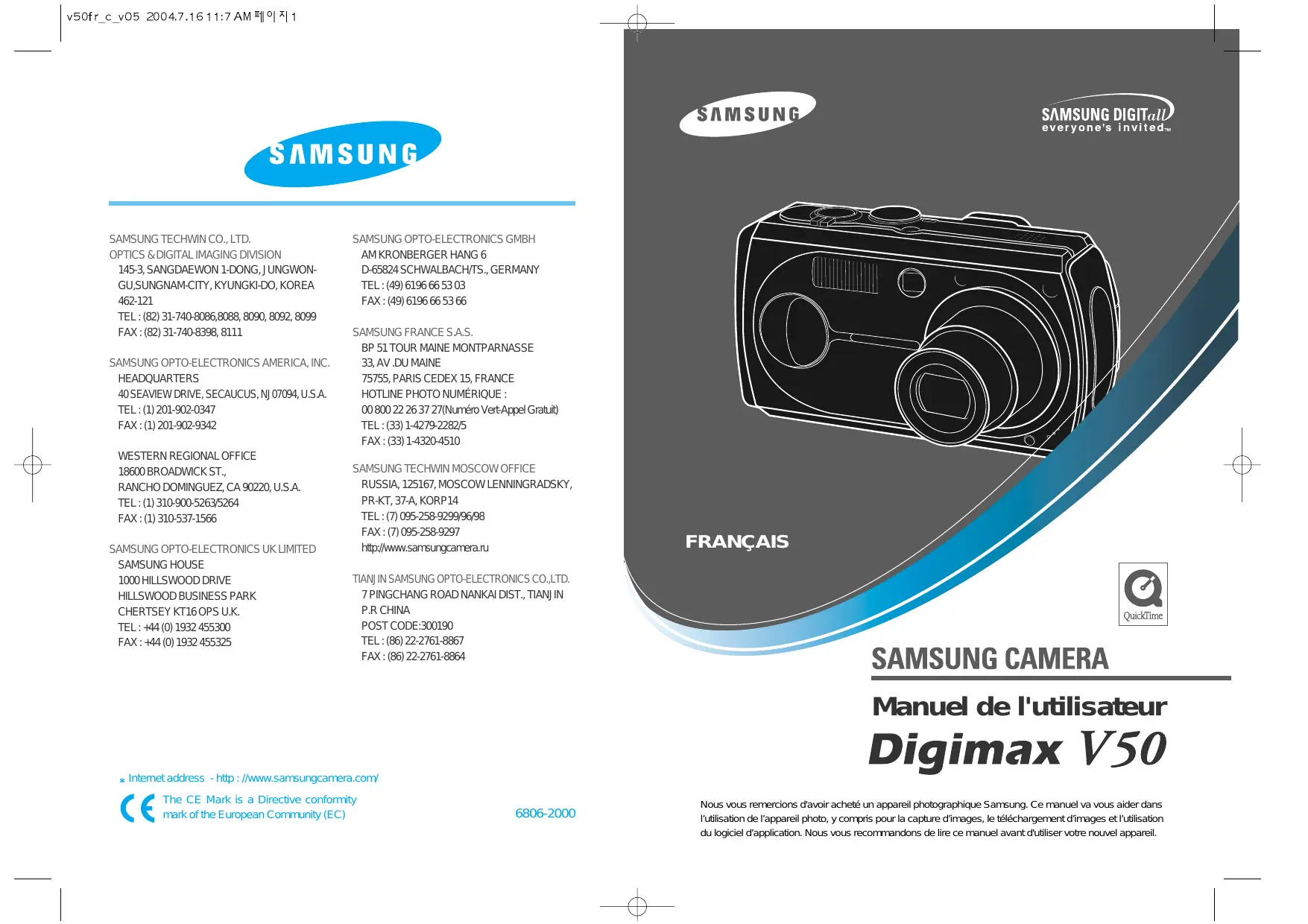 Mémo vocal sur image fixe (Max. 10 secondes.) Impression de la date Date & Heure, Date, Désactivé (sélectionnable par l'utilisateur) Modes : Automatique, Program, Myset(MonPARAM), A/S/M, Voix, Photo de nuit, Scène * Scene : Portrait, Enfants, Paysage, Gros Plan, Coucher de soleil, Aube, Contre Jour, Artifice, Plage&Neige 190g (sans les piles et la carte) 0 ~ 40 5 ~ 85 % Pilote de stockage (Windows98/98SE/2000/ME/XP, Mac OS 9.0 ~ 10.2) Digimax Viewer, QuickTime Player, ArcSoft PhotoImpression Vous ne pouvez, en aucun cas, reproduire tout ou partie ni du logiciel ni du manuel de l'utilisateur. Les droits du logiciel sont concédés sous licence uniquement pour l’utilisation avec un appareil photo. Dans l’éventualité hautement improbable d’un défaut de fabrication, Samsung s'engage à réparer l’appareil photo ou à le remplacer par un autre. Toutefois, Samsung ne peut, d’aucune manière que ce soit, être tenu responsable des dommages causés en raison d’un usage inapproprié de l’appareil photo. L'utilisation d'un PC assemblé ou non ou d'un système d'exploitation assemblé qui n'a pas été agréé par le fabricant n'est pas couverte par la garantie Samsung. Avant de lire le présent manuel de l’utilisateur, vous devez être familiarisé avec le fonctionnement de base d’un PC et de son système d’exploitation (O/S).