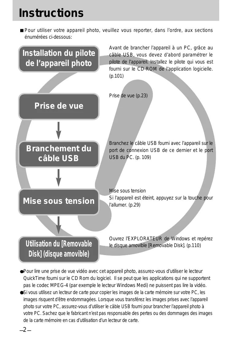 Disque amovible Afin de pouvoir utiliser votre appareil photo comme disque amovible, installez le pilote USB(voir p. 101).
