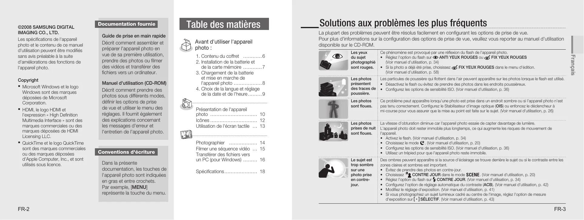 - Si vous photographiez un sujet lumineux cadré au centre de l'image, réglez l'option de mesure SÉLECTIF. (Voir manuel d'utilisation, p. 43) d'exposition sur Français ©2008 SAMSUNG DIGITAL IMAGING CO., LTD. Les spécifications de l'appareil photo et le contenu de ce manuel d'utilisation peuvent être modifiés sans avis préalable à la suite d'améliorations des fonctions de l'appareil photo. FR-3 p. 1 « Informations relatives à la santé et à la sécurité » Informations relatives à la santé et à la sécurité Respectez toujours les consignes suivantes afin de prévenir toute situation dangereuse ou illégale pendant l'utilisation de l'appareil photo et conservez ce guide pour pouvoir vous y référer ultérieurement. Attention Situations susceptibles d'endommager votre appareil photo ou d'autres appareils Situations susceptibles de vous blesser ou de blesser d'autres personnes N'utilisez pas l'appareil photo à proximité de gaz et de liquides inflammables ou explosifs Évitez d'endommager la vue des sujets photographiés N'utilisez pas l'appareil photo à proximité de carburants, de combustibles ou de produits chimiques inflammables. Ne transportez et ne stockez jamais de liquides ou de gaz inflammables ou de matériaux explosifs dans le même habitacle que l'appareil photo ou ses accessoires. N'utilisez pas le flash à proximité (à moins d'un mètre) des personnes ou des animaux. L'utilisation du flash trop près des yeux du sujet peut provoquer des lésions temporaires ou permanentes. Ne laissez pas l'appareil photo à la portée des enfants en bas âge ou des animaux domestiques Tenez l'appareil photo et ses accessoires hors de portée des enfants en bas âge et des animaux. L'ingestion de petites pièces peut provoquer un étouffement ou des blessures graves. Les composants et les accessoires peuvent également présenter des risques de blessure. FR-4 Utilisez les batteries et les chargeurs avec précaution et respectez les consignes de recyclage