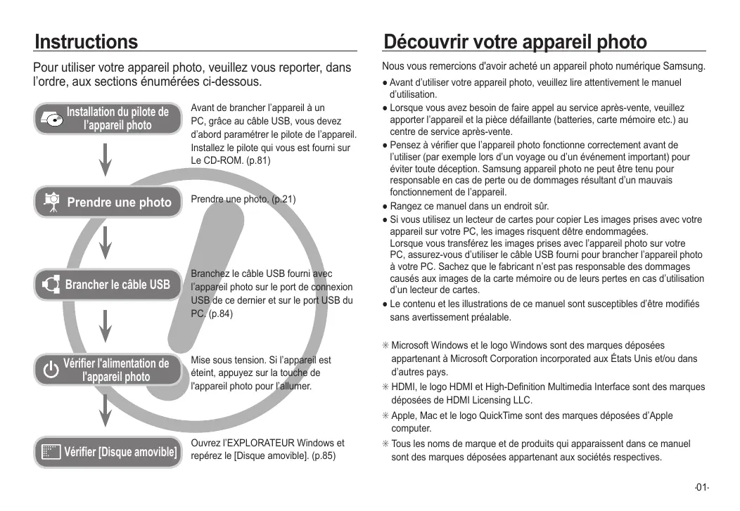 Instructions Découvrir votre appareil photo Pour utiliser votre appareil photo, veuillez vous reporter, dans l’ordre, aux sections énumérées ci-dessous. Nous vous remercions d'avoir acheté un appareil photo numérique Samsung. Installation du pilote de l’appareil photo Avant de brancher l’appareil à un PC, grâce au câble USB, vous devez d’abord paramétrer le pilote de l’appareil. Installez le pilote qui vous est fourni sur Le CD-ROM. (p.81) Prendre une photo Prendre une photo. (p.21) Brancher le câble USB Branchez le câble USB fourni avec l’appareil photo sur le port de connexion USB de ce dernier et sur le port USB du PC. (p.84) Vérifier l'alimentation de l'appareil photo Mise sous tension. Si l’appareil est éteint, appuyez sur la touche de l'appareil photo pour l’allumer. Vérifier [Disque amovible] Ouvrez l’EXPLORATEUR Windows et repérez le [Disque amovible]. (p.85) ● Avant d’utiliser votre appareil photo, veuillez lire attentivement le manuel d’utilisation. ● Lorsque vous avez besoin de faire appel au service après-vente, veuillez apporter l’appareil et la pièce défaillante (batteries, carte mémoire etc.) au centre de service après-vente. ● Pensez à vérifier que l’appareil photo fonctionne correctement avant de l’utiliser (par exemple lors d’un voyage ou d’un événement important) pour éviter toute déception. Samsung appareil photo ne peut être tenu pour responsable en cas de perte ou de dommages résultant d’un mauvais fonctionnement de l’appareil. ● Rangez ce manuel dans un endroit sûr. ● Si vous utilisez un lecteur de cartes pour copier Les images prises avec votre appareil sur votre PC, les images risquent dêtre endommagées. Lorsque vous transférez les images prises avec l’appareil photo sur votre PC, assurez-vous d’utiliser le câble USB fourni pour brancher l’appareil photo à votre PC. Sachez que le fabricant n’est pas responsable des dommages causés aux images de la carte mémoire ou de leurs pertes en cas d’utilisation d’un lecteur de cartes. ● Le contenu et les illustrations de ce manuel sont susceptibles d’être modifiés sans avertissement préalable. ✳ Microsoft Windows et le logo Windows sont des marques déposées appartenant à Microsoft Corporation incorporated aux États Unis et/ou dans d’autres pays. ✳ HDMI, le logo HDMI et High-Definition Multimedia Interface sont des marques déposées de HDMI Licensing LLC. ✳ Apple, Mac et le logo QuickTime sont des marques déposées d’Apple computer. ✳ Tous les noms de marque et de produits qui apparaissent dans ce manuel sont des marques déposées appartenant aux sociétés respectives.