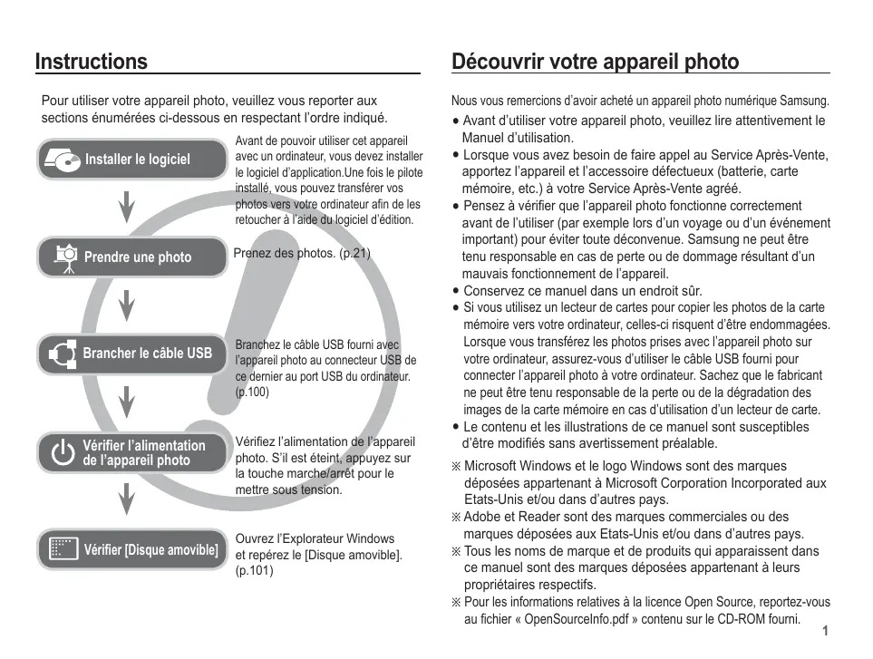 Découvrir votre appareil photo Instructions Pour utiliser votre appareil photo, veuillez vous reporter aux sections énumérées ci-dessous en respectant l’ordre indiqué. Installer le logiciel Prendre une photo Brancher le câble USB Vérifier l’alimentation de l’appareil photo Vérifier [Disque amovible] Avant de pouvoir utiliser cet appareil avec un ordinateur, vous devez installer le logiciel d’application.Une fois le pilote installé, vous pouvez transférer vos photos vers votre ordinateur afin de les retoucher à l’aide du logiciel d’édition. Prenez des photos. (p.21) Branchez le câble USB fourni avec l’appareil photo au connecteur USB de ce dernier au port USB du ordinateur. (p.100) Vérifiez l’alimentation de l’appareil photo. S’il est éteint, appuyez sur la touche marche/arrêt pour le mettre sous tension. Ouvrez l’Explorateur Windows et repérez le [Disque amovible]. (p.101) Nous vous remercions d’avoir acheté un appareil photo numérique Samsung. Avant d’utiliser votre appareil photo, veuillez lire attentivement le Manuel d’utilisation. Lorsque vous avez besoin de faire appel au Service Après-Vente, apportez l’appareil et l’accessoire défectueux (batterie, carte mémoire, etc.) à votre Service Après-Vente agréé. Pensez à vérifier que l’appareil photo fonctionne correctement avant de l’utiliser (par exemple lors d’un voyage ou d’un événement important) pour éviter toute déconvenue. Samsung ne peut être tenu responsable en cas de perte ou de dommage résultant d’un mauvais fonctionnement de l’appareil. Conservez ce manuel dans un endroit sûr. Si vous utilisez un lecteur de cartes pour copier les photos de la carte mémoire vers votre ordinateur, celles-ci risquent d’être endommagées. Lorsque vous transférez les photos prises avec l’appareil photo sur votre ordinateur, assurez-vous d’utiliser le câble USB fourni pour connecter l’appareil photo à votre ordinateur. Sachez que le fabricant ne peut être tenu responsable de la perte ou de la dégradation des images de la carte mémoire en cas d’utilisation d’un lecteur de carte. Le contenu et les illustrations de ce manuel sont susceptibles d’être modifiés sans avertissement préalable. Ä Microsoft Windows et le logo Windows sont des marques déposées appartenant à Microsoft Corporation Incorporated aux Etats-Unis et/ou dans d’autres pays. Ä Adobe et Reader sont des marques commerciales ou des marques déposées aux Etats-Unis et/ou dans d’autres pays. Ä Tous les noms de marque et de produits qui apparaissent dans ce manuel sont des marques déposées appartenant à leurs propriétaires respectifs. Ä Pour les informations relatives à la licence Open Source, reportez-vous au fichier « OpenSourceInfo.pdf » contenu sur le CD-ROM fourni.
