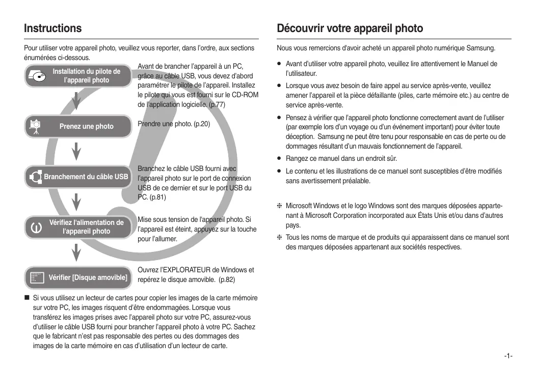 Instructions Découvrir votre appareil photo Pour utiliser votre appareil photo, veuillez vous reporter, dans l’ordre, aux sections énumérées ci-dessous. Avant de brancher l’appareil à un PC, Installation du pilote de grâce au câble USB, vous devez d’abord l’appareil photo paramétrer le pilote de l’appareil. Installez le pilote qui vous est fourni sur le CD-ROM de l’application logicielle. (p.77) Nous vous remercions d'avoir acheté un appareil photo numérique Samsung. Prenez une photo Branchement du câble USB Prendre une photo. (p.20) Branchez le câble USB fourni avec l’appareil photo sur le port de connexion USB de ce dernier et sur le port USB du PC. (p.81) Vérifiez l'alimentation de l'appareil photo Mise sous tension de l'appareil photo. Si l’appareil est éteint, appuyez sur la touche pour l’allumer. Vérifier [Disque amovible] Ouvrez l’EXPLORATEUR de Windows et repérez le disque amovible. (p.82)