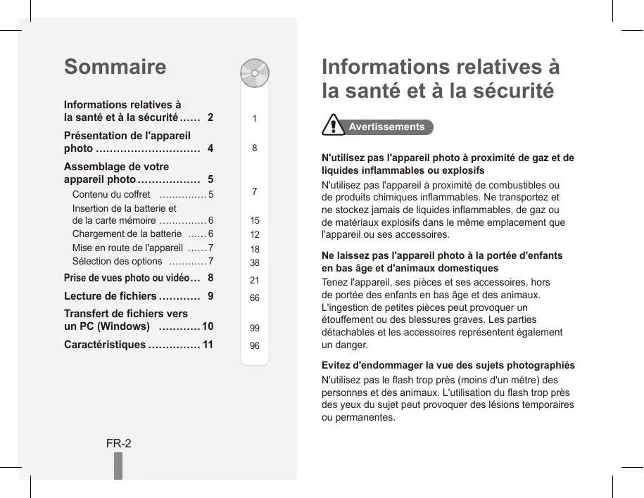 Avertissements N'utilisez pas l'appareil photo à proximité de gaz et de liquides inflammables ou explosifs N'utilisez pas l'appareil à proximité de combustibles ou de produits chimiques inflammables. Ne transportez et ne stockez jamais de liquides inflammables, de gaz ou de matériaux explosifs dans le même emplacement que l'appareil ou ses accessoires. Ne laissez pas l'appareil photo à la portée d'enfants en bas âge et d'animaux domestiques Tenez l'appareil, ses pièces et ses accessoires, hors de portée des enfants en bas âge et des animaux. L'ingestion de petites pièces peut provoquer un étouffement ou des blessures graves. Les parties détachables et les accessoires représentent également un danger. Evitez d'endommager la vue des sujets photographiés N'utilisez pas le flash trop près (moins d'un mètre) des personnes et des animaux. L'utilisation du flash trop près des yeux du sujet peut provoquer des lésions temporaires ou permanentes. FR-2 Attention Manipulez et stockez votre appareil avec soins