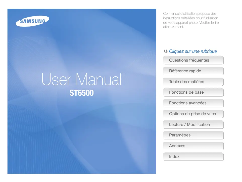 Ce manuel d'utilisation propose des instructions détaillées pour l'utilisation de votre appareil photo. Veuillez le lire attentivement. Ä Cliquez sur une rubrique Questions fréquentes Référence rapide User Manual Table des matières ST6500 Fonctions de base Fonctions avancées Options de prise de vues Lecture / Modification Paramètres Annexes Index Informations relatives à la santé et à la sécurité Respectez toujours les consignes et conseils d'utilisation suivants afin de prévenir toute situation dangereuse et de garantir un fonctionnement optimal de votre appareil photo. Ne laissez pas l'appareil photo à la portée d'enfants en bas âge ou d'animaux domestiques. Tenez l'appareil, ses pièces et ses accessoires, hors de portée des enfants en bas âge et des animaux. L'ingestion de petites pièces peut provoquer un étouffement ou des blessures graves. Les composants et les accessoires peuvent également présenter des risques de blessure. Avertissement—situations susceptibles de vous blesser ou de blesser d'autres personnes Ne démontez pas ou n'essayez pas de réparer vous-même votre appareil photo. Vous pourriez recevoir une décharge électrique ou endommager l'appareil photo. N'utilisez pas l'appareil photo à proximité de gaz ou de liquides inflammables ou explosifs. Vous risqueriez de provoquer une explosion ou un incendie. Evitez toute exposition prolongée de l'appareil photo à la lumière directe du soleil ou à des températures élevées. Une exposition prolongée à la lumière directe du soleil ou à des températures très élevées peut endommager de manière permanente les composants internes de l'appareil photo. Ne laissez pas pénétrer de matériaux inflammables dans l'appareil photo ou ne stockez pas ces matériaux à proximité de l'appareil photo. Vous risqueriez de recevoir une décharge électrique ou de provoquer un incendie. Evitez de couvrir l'appareil photo ou le chargeur avec des couvertures ou des vêtements. L'appareil photo pourrait surchauffer, se déformer ou prendre feu. N'utilisez pas l'appareil photo avec les mains mouillées. Vous pourriez recevoir une décharge électrique. Si du liquide ou des corps étrangers pénètrent dans l'appareil photo, déconnectez toutes les sources d'alimentation comme la batterie ou le chargeur, puis contactez un service après-vente de Samsung. Evitez d'endommager la vue des sujets photographiés. N'utilisez pas le flash à proximité (à moins d'un mètre) de personnes ou d'animaux. L'utilisation du flash trop près des yeux du sujet peut provoquer des lésions temporaires ou permanentes.