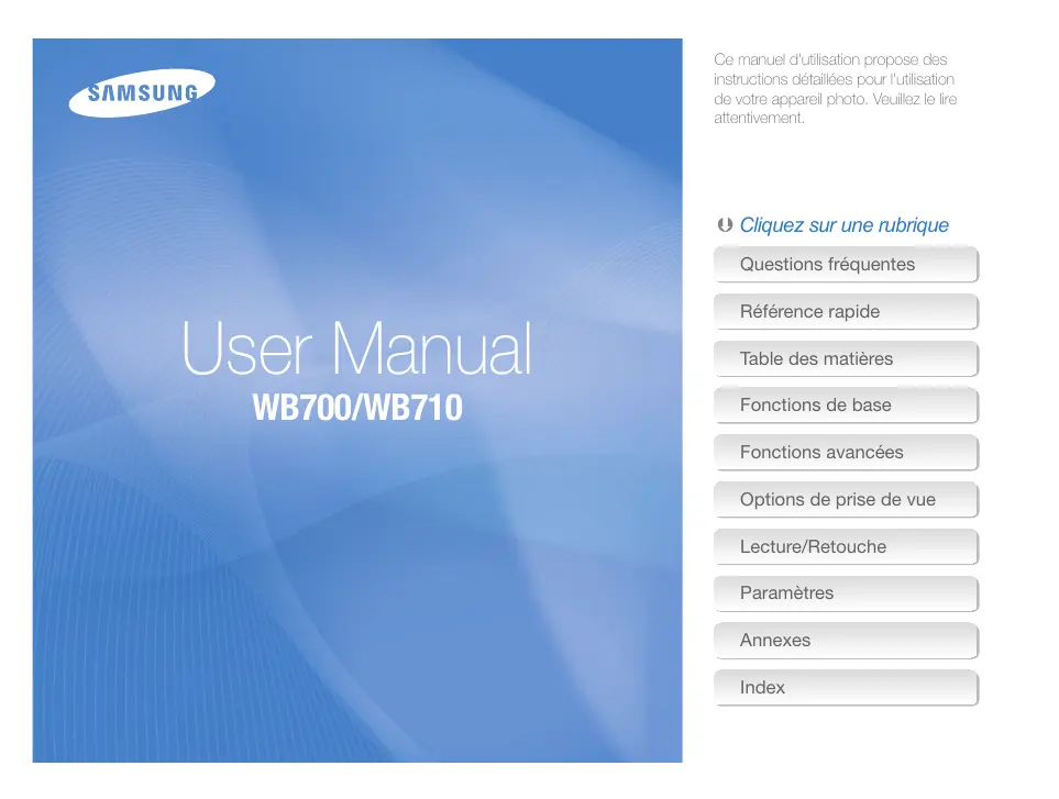 Ce manuel d'utilisation propose des instructions détaillées pour l'utilisation de votre appareil photo. Veuillez le lire attentivement. Ä Cliquez sur une rubrique Questions fréquentes Référence rapide User Manual Table des matières WB700/WB710 Fonctions de base Fonctions avancées Options de prise de vue Lecture/Retouche Paramètres Annexes Index Informations relatives à la santé et à la sécurité Respectez toujours les consignes et conseils d'utilisation suivants afin de prévenir toute situation dangereuse et de garantir un fonctionnement optimal de votre appareil photo. Ne laissez pas l'appareil photo à la portée d'enfants en bas âge ou d'animaux domestiques. Tenez l'appareil, ses pièces et ses accessoires, hors de portée des enfants en bas âge et des animaux. L'ingestion de petites pièces peut provoquer un étouffement ou des blessures graves. Les composants et les accessoires peuvent également présenter des risques de blessure. Avertissement—situations susceptibles de vous blesser ou de blesser d'autres personnes Ne démontez pas ou n'essayez pas de réparer vous-même votre appareil photo. Vous pourriez recevoir une décharge électrique ou endommager l'appareil photo. N'utilisez pas l'appareil photo à proximité de gaz ou de liquides inflammables ou explosifs. Vous risqueriez de provoquer une explosion ou un incendie. Evitez toute exposition prolongée de l'appareil photo à la lumière directe du soleil ou à des températures élevées. Une exposition prolongée à la lumière directe du soleil ou à des températures très élevées peut endommager de manière permanente les composants internes de l'appareil photo. Ne laissez pas pénétrer de matériaux inflammables dans l'appareil photo ou ne stockez pas ces matériaux à proximité de l'appareil photo. Vous risqueriez de recevoir une décharge électrique ou de provoquer un incendie. Evitez de couvrir l'appareil photo ou le chargeur avec des couvertures ou des vêtements. L'appareil photo pourrait surchauffer, se déformer ou prendre feu. N'utilisez pas l'appareil photo avec les mains mouillées. Vous pourriez recevoir une décharge électrique. Si du liquide ou des corps étrangers pénètrent dans l'appareil photo, déconnectez toutes les sources d'alimentation comme la batterie ou le chargeur, puis contactez un service après-vente de Samsung. Evitez d'endommager la vue des sujets photographiés. N'utilisez pas le flash à proximité (à moins d'un mètre) de personnes ou d'animaux. L'utilisation du flash trop près des yeux du sujet peut provoquer des lésions temporaires ou permanentes.