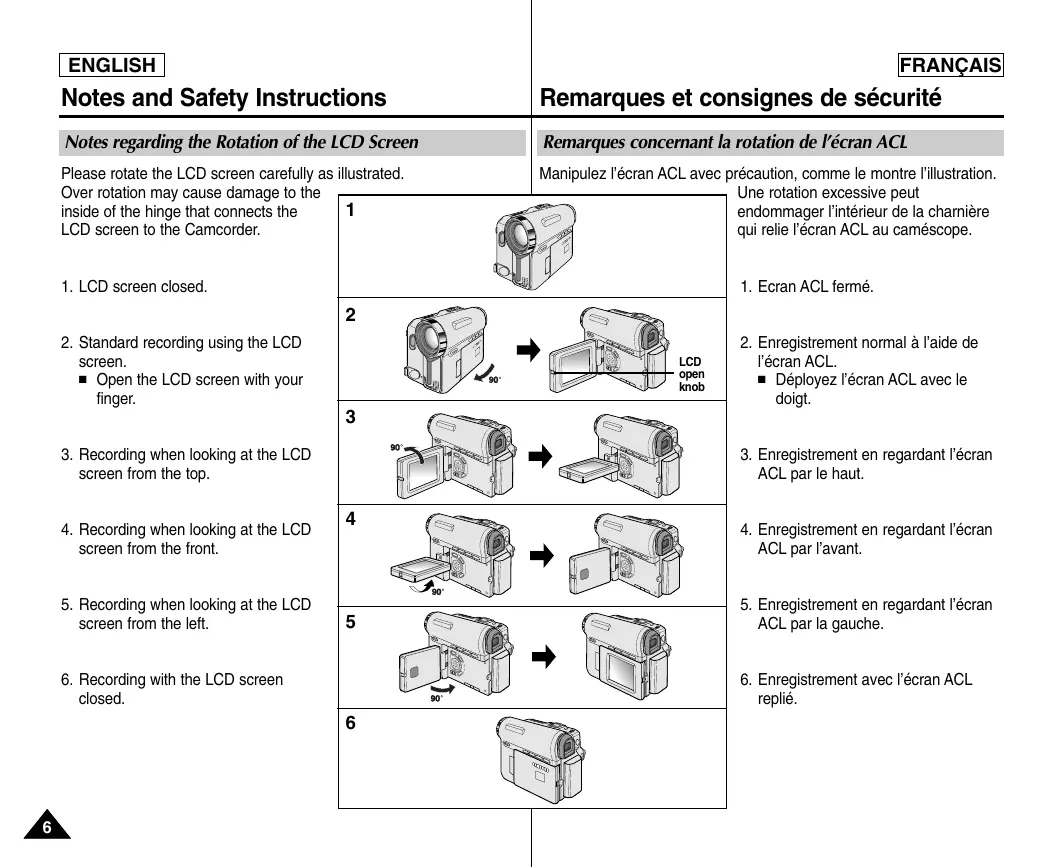 Ce phénomène est normal et n’a aucune influence sur l’image enregistrée. 2. Lorsque vous utilisez l’écran ACL en plein soleil ou à l’extérieur, il se peut que l’image soit difficile à voir. Nous vous recommandons dans ce cas de recourir au viseur. 3. La lumière directe du soleil est susceptible d’endommager l’écran ACL.