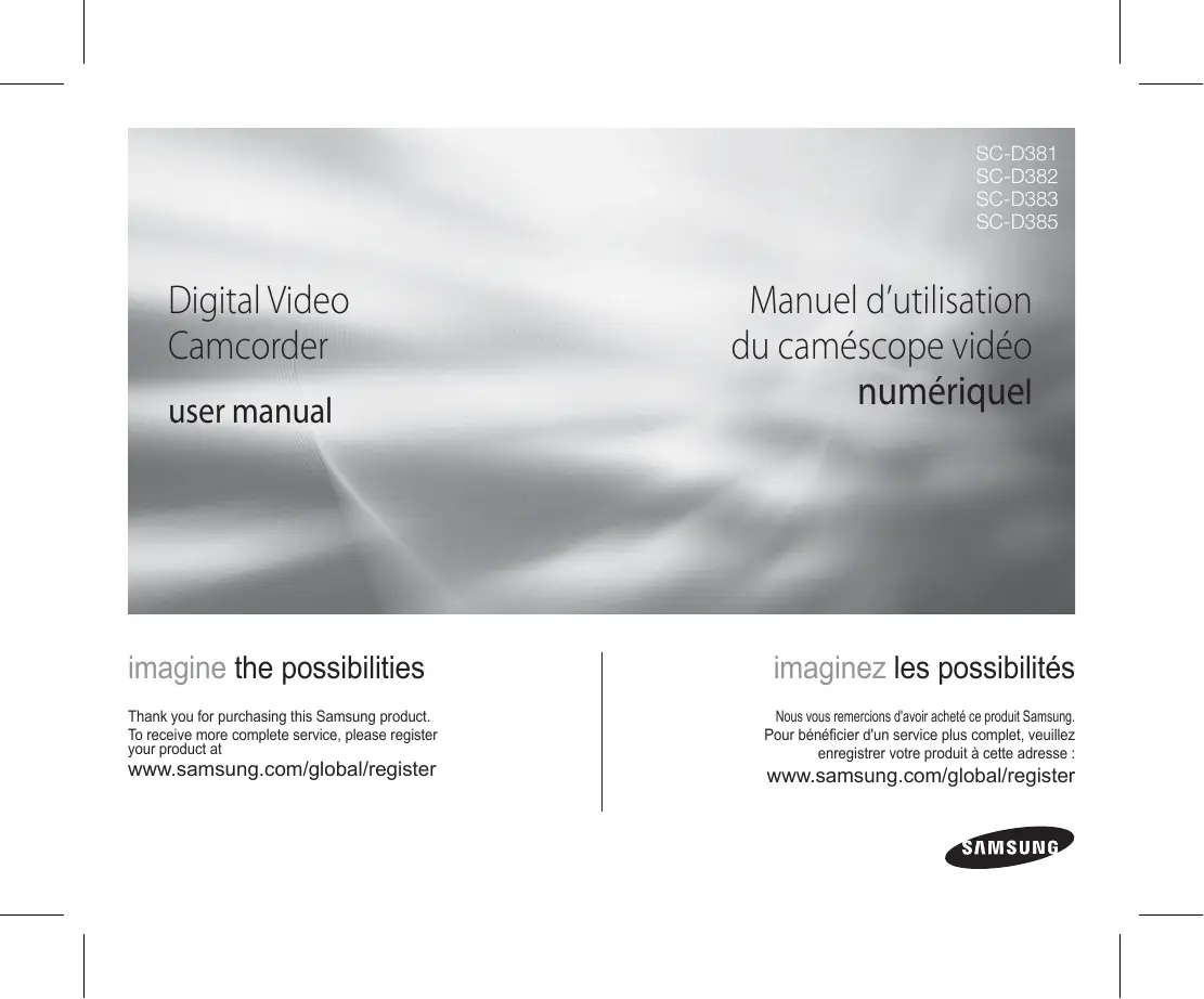 SC-D381 SC-D382 SC-D383 SC-D385 Digital Video Camcorder user manual imagine the possibilities Thank you for purchasing this Samsung product. To receive more complete service, please register your product at www.samsung.com/global/register Manuel d’utilisation du caméscope vidéo numériquel imaginez les possibilités Nous vous remercions d'avoir acheté ce produit Samsung. Pour bénéficier d'un service plus complet, veuillez enregistrer votre produit à cette adresse : www.samsung.com/global/register key features of your miniDV camcorder caractéristiques principales de votre caméscope Mini-DV