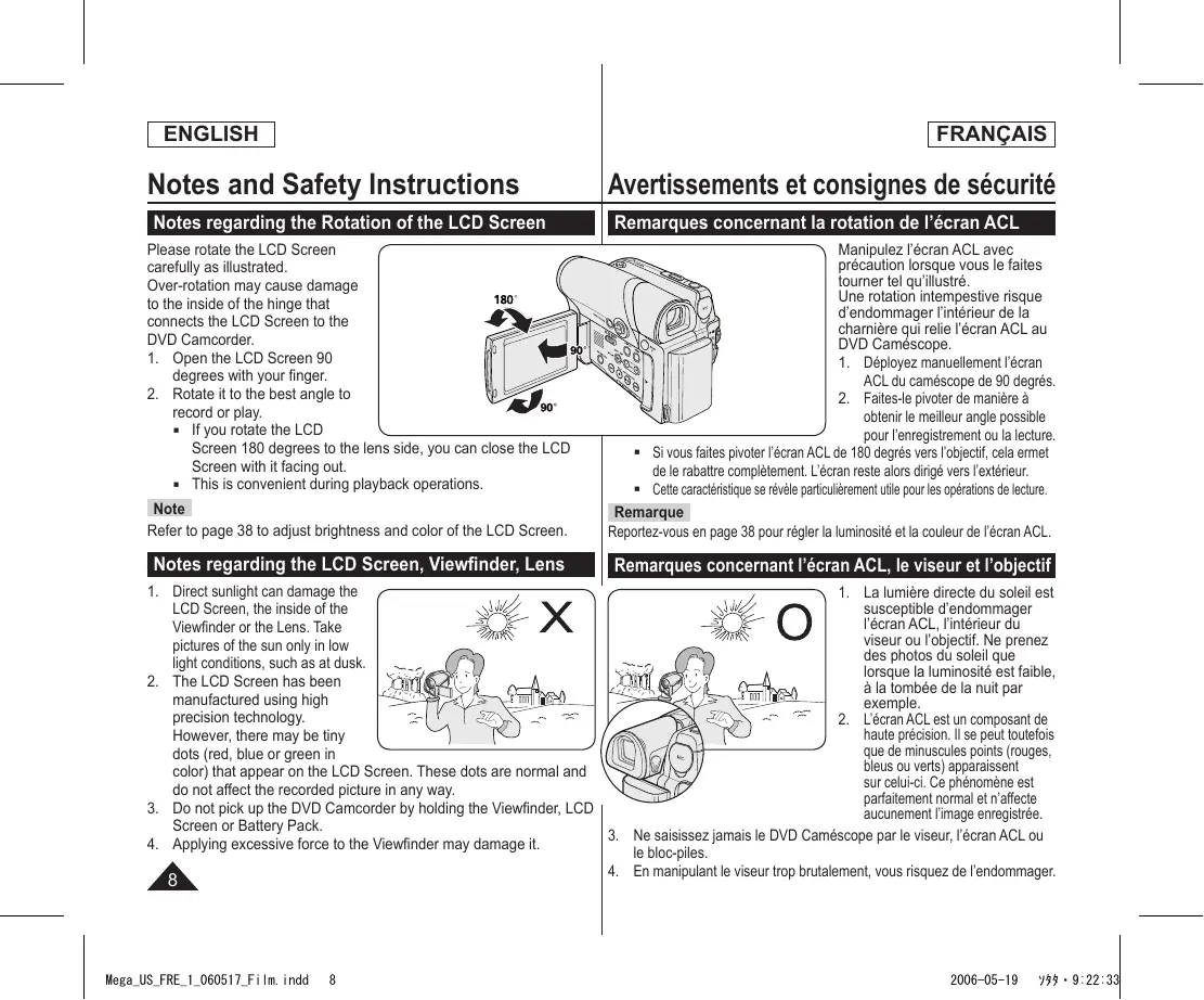 2006-05-19 ソタタ・9:22:33 ENGLISH FRANÇAIS Notes and Safety Instructions Notes regarding the Rotation of the LCD Screen Avertissements et consignes de sécurité Remarques concernant la rotation de l’écran ACL Note Refer to page 38 to adjust brightness and color of the LCD Screen. Manipulez l’écran ACL avec précaution lorsque vous le faites tourner tel qu’illustré. Une rotation intempestive risque d’endommager l’intérieur de la charnière qui relie l’écran ACL au DVD Caméscope.