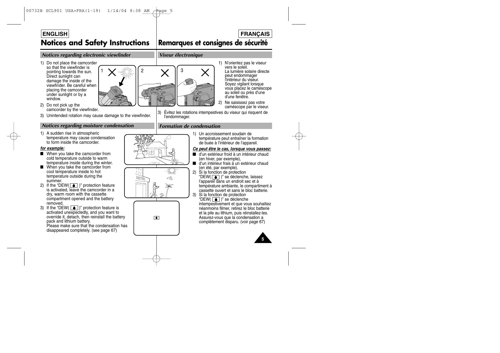 fermé. Objectif ✤ Veillez à ne pas diriger l’objectif vers le soleil. La lumière solaire directe peut endommager le dispositif électronique à transfert de charge (CCD). 00732B SCL901 USA+FRA(1-19) 1/14/04 8:38 AM Page 5 ENGLISH FRANÇAIS Notices and Safety Instructions Remarques et consignes de sécurité Notices regarding electronic viewfinder Viseur électronique