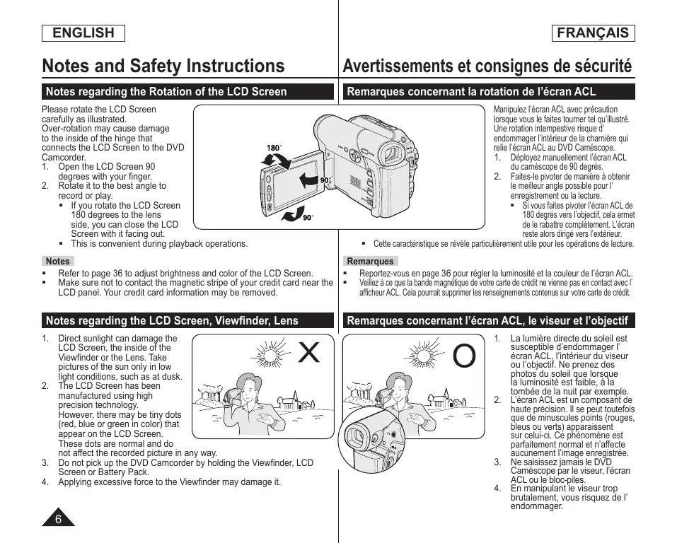 record or play. If you rotate the LCD Screen 180 degrees to the lens side, you can close the LCD Screen with it facing out. This is convenient during playback operations. Avertissements et consignes de sécurité Remarques concernant la rotation de l’écran ACL Manipulez l’écran ACL avec précaution lorsque vous le faites tourner tel qu’illustré. Une rotation intempestive risque d’ endommager l’intérieur de la charnière qui relie l’écran ACL au DVD Caméscope.