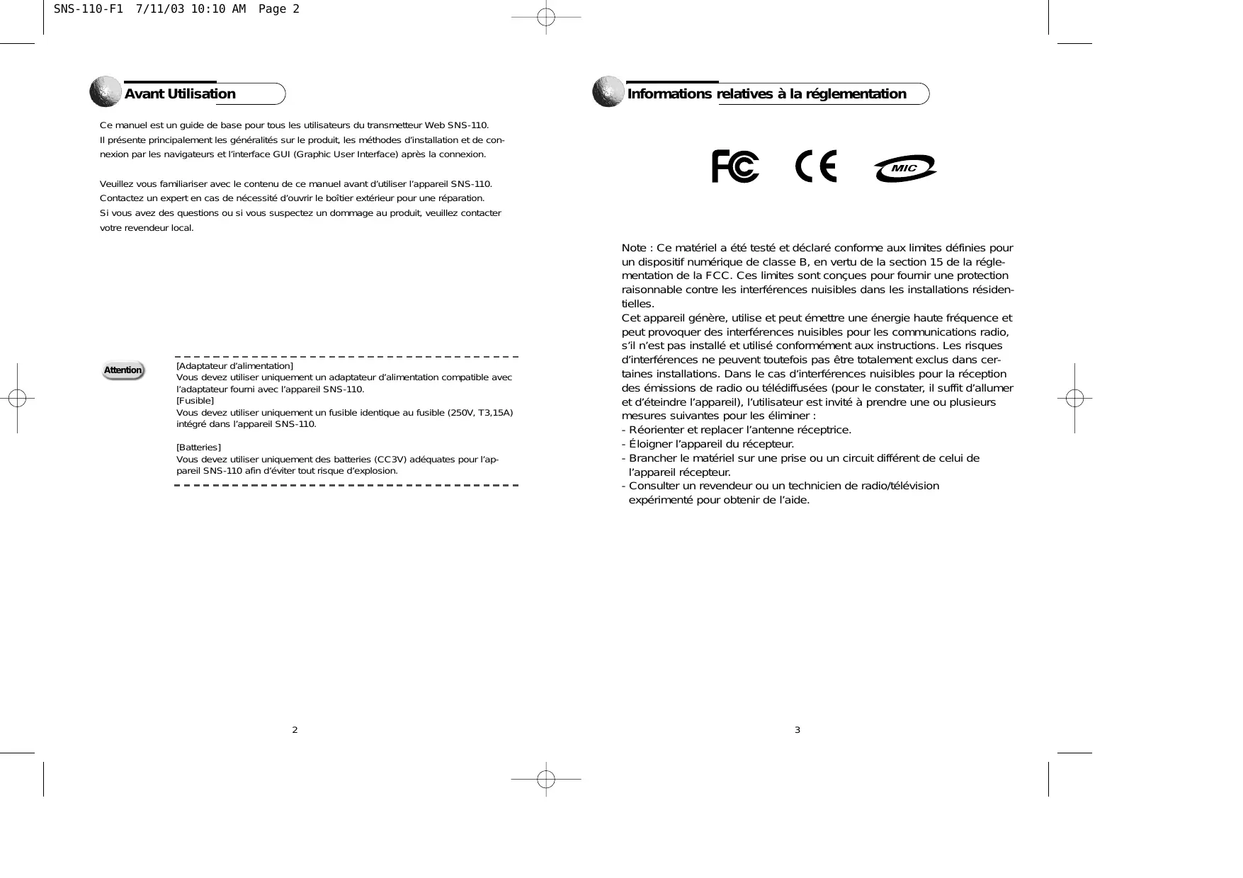SNS-110-F1 7/11/03 10:10 AM Page 2 Avant Utilisation Informations relatives à la réglementation Ce manuel est un guide de base pour tous les utilisateurs du transmetteur Web SNS-110. Il présente principalement les généralités sur le produit, les méthodes d’installation et de connexion par les navigateurs et l’interface GUI (Graphic User Interface) après la connexion. Veuillez vous familiariser avec le contenu de ce manuel avant d’utiliser l’appareil SNS-110. Contactez un expert en cas de nécessité d’ouvrir le boîtier extérieur pour une réparation. Si vous avez des questions ou si vous suspectez un dommage au produit, veuillez contacter votre revendeur local. Attention [Adaptateur d’alimentation] Vous devez utiliser uniquement un adaptateur d’alimentation compatible avec l’adaptateur fourni avec l’appareil SNS-110. [Fusible] Vous devez utiliser uniquement un fusible identique au fusible (250V, T3,15A) intégré dans l’appareil SNS-110. [Batteries] Vous devez utiliser uniquement des batteries (CC3V) adéquates pour l’appareil SNS-110 afin d’éviter tout risque d’explosion.