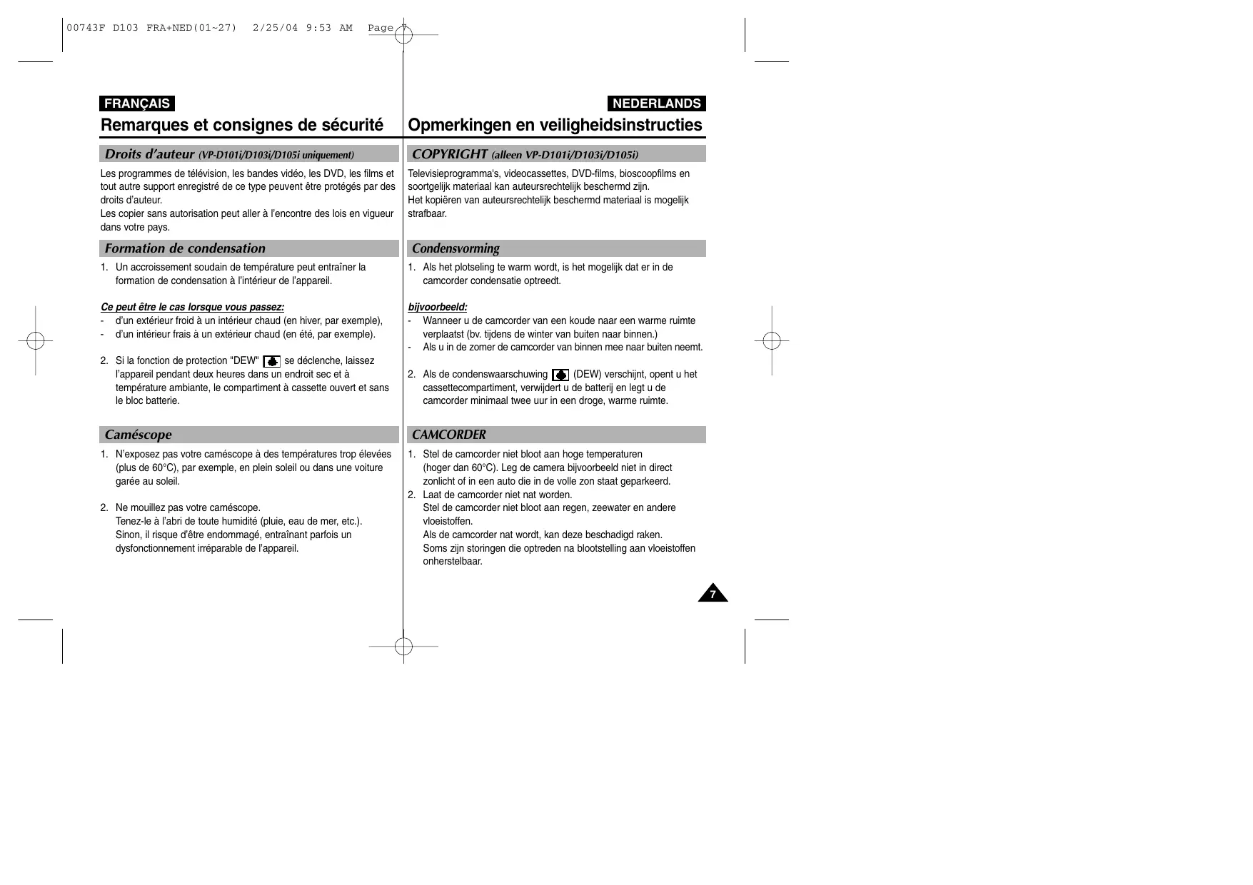 00743F D103 FRA+NED(01~27) 2/25/04 9:53 AM Page 7 FRANÇAIS Remarques et consignes de sécurité Droits d’auteur (VP-D101i/D103i/D105i uniquement) Les programmes de télévision, les bandes vidéo, les DVD, les films et tout autre support enregistré de ce type peuvent être protégés par des droits d’auteur. Les copier sans autorisation peut aller à l’encontre des lois en vigueur dans votre pays. Formation de condensation NEDERLANDS Opmerkingen en veiligheidsinstructies COPYRIGHT (alleen VP-D101i/D103i/D105i) Televisieprogramma's, videocassettes, DVD-films, bioscoopfilms en soortgelijk materiaal kan auteursrechtelijk beschermd zijn. Het kopiëren van auteursrechtelijk beschermd materiaal is mogelijk strafbaar. Condensvorming