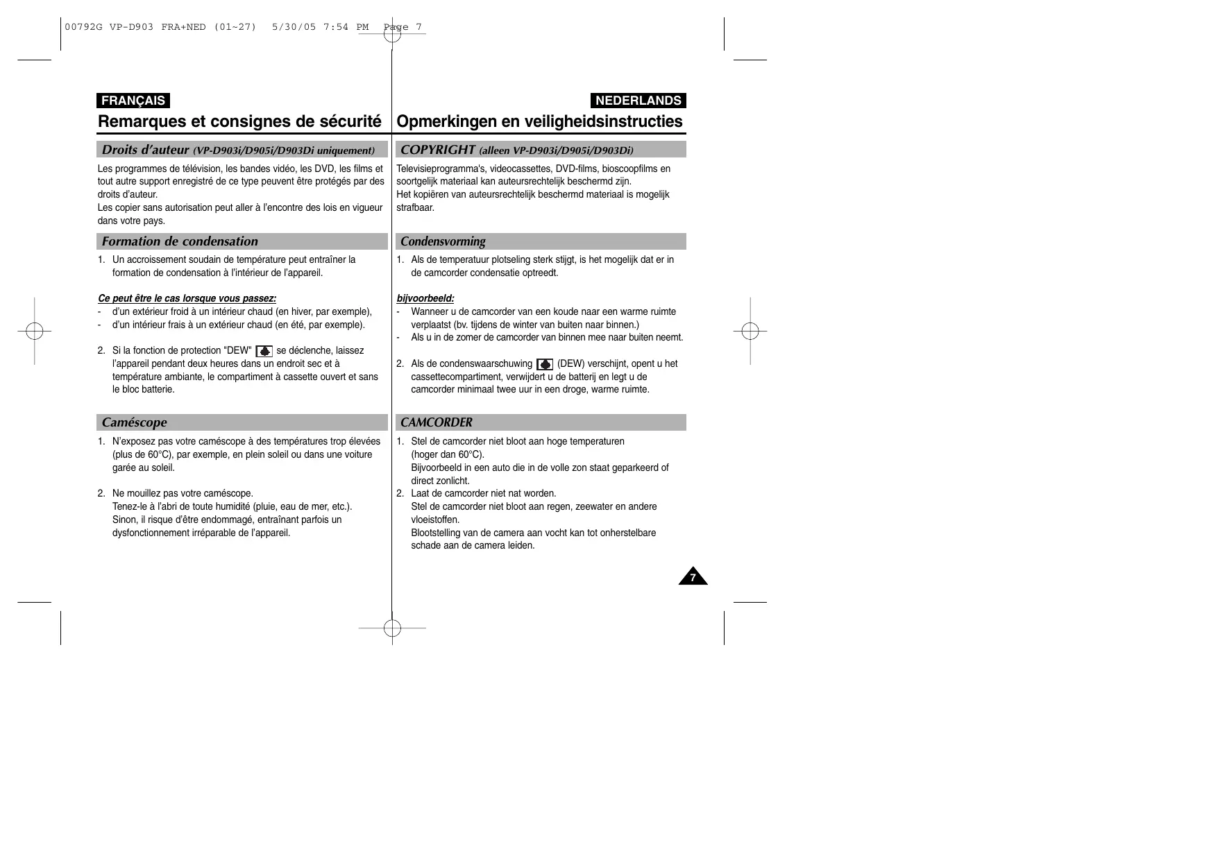 LCD-scherm. 00792G VP-D903 FRA+NED (01~27) 5/30/05 7:54 PM Page 7 FRANÇAIS NEDERLANDS Remarques et consignes de sécurité Opmerkingen en veiligheidsinstructies Droits d’auteur (VP-D903i/D905i/D903Di uniquement) Les programmes de télévision, les bandes vidéo, les DVD, les films et tout autre support enregistré de ce type peuvent être protégés par des droits d’auteur. Les copier sans autorisation peut aller à l’encontre des lois en vigueur dans votre pays. Formation de condensation COPYRIGHT (alleen VP-D903i/D905i/D903Di) Televisieprogramma's, videocassettes, DVD-films, bioscoopfilms en soortgelijk materiaal kan auteursrechtelijk beschermd zijn. Het kopiëren van auteursrechtelijk beschermd materiaal is mogelijk strafbaar. Condensvorming