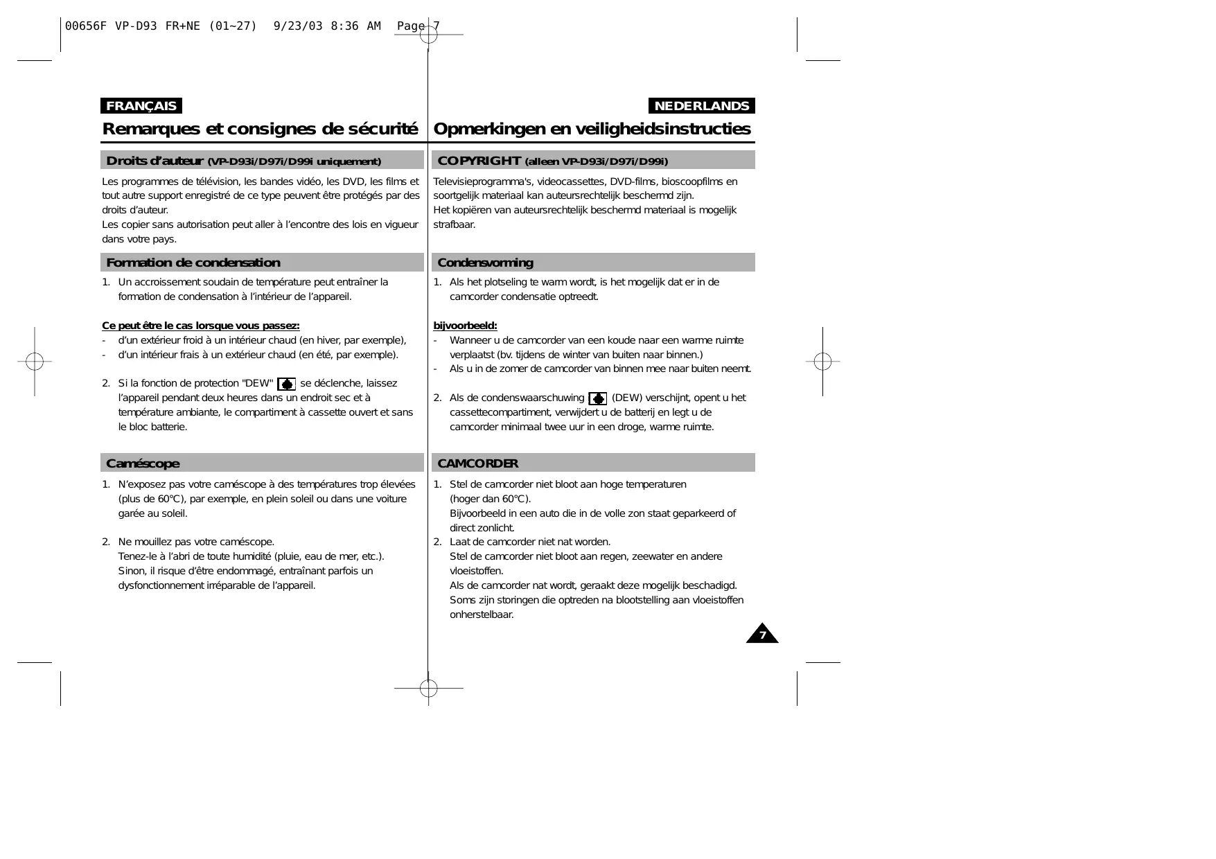 LCD-scherm. 00656F VP-D93 FR+NE (01~27) 9/23/03 8:36 AM Page 7 FRANÇAIS NEDERLANDS Remarques et consignes de sécurité Opmerkingen en veiligheidsinstructies Droits d’auteur (VP-D93i/D97i/D99i uniquement) Les programmes de télévision, les bandes vidéo, les DVD, les films et tout autre support enregistré de ce type peuvent être protégés par des droits d’auteur. Les copier sans autorisation peut aller à l’encontre des lois en vigueur dans votre pays. Formation de condensation COPYRIGHT (alleen VP-D93i/D97i/D99i) Televisieprogramma's, videocassettes, DVD-films, bioscoopfilms en soortgelijk materiaal kan auteursrechtelijk beschermd zijn. Het kopiëren van auteursrechtelijk beschermd materiaal is mogelijk strafbaar. Condensvorming