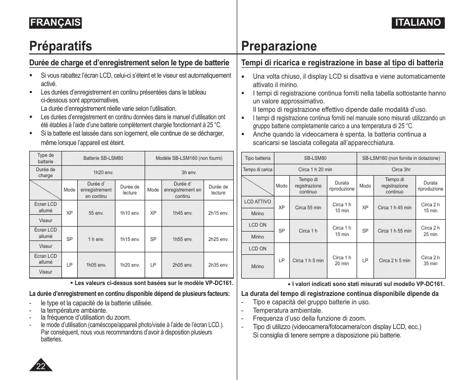 Si vous rabattez l’écran LCD, celui-ci s’éteint et le viseur est automatiquement activé. Les durées d’enregistrement en continu présentées dans le tableau ci-dessous sont approximatives. La durée d’enregistrement réelle varie selon l’utilisation. Les durées d’enregistrement en continu données dans le manuel d’utilisation ont été établies à l’aide d’une batterie complètement chargée fonctionnant à 25 °C. Si la batterie est laissée dans son logement, elle continue de se décharger, même lorsque l’appareil est éteint. Type de batterie Batterie SB-LSM80 Durée de charge Ecran LCD allumé Modèle SB-LSM160 (non fourni) 1h20 env. 3h env. Mode Durée d’ enregistrement en continu Durée de lecture Durée d’ Mode enregistrement en continu