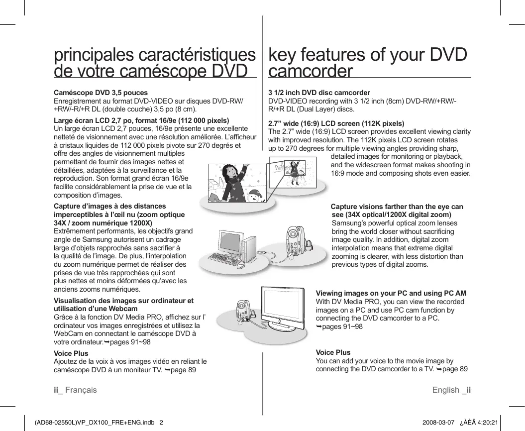 VP-DX100( i ) VP-DX100H VP-DX102 VP-DX103( i ) VP-DX104 VP-DX105( i ) Caméscope DVD manuel d’utilisation DVD Camcorder user manual imaginez toutes les possibilités imagine the possibilities www.samsung.com/global/register www.samsung.com/global/register Nous vous remercions d’avoir choisi ce produit Samsung. Pour bénéficier d’un service plus complet, veuillez enregistrer votre produit à l’adresse (AD68-02550L)VP_DX100_FRE+ENG.indb 1 Thank you for purchasing this Samsung product. To receive more complete service, please register your product at 2008-03-07 ¿ÀÈÄ 4:20:01 principales caractéristiques key features of your DVD de votre caméscope DVD camcorder Caméscope DVD 3,5 pouces Enregistrement au format DVD-VIDEO sur disques DVD-RW/ +RW/-R/+R DL (double couche) 3,5 po (8 cm). 3 1/2 inch DVD disc camcorder DVD-VIDEO recording with 3 1/2 inch (8cm) DVD-RW/+RW/R/+R DL (Dual Layer) discs. Large écran LCD 2,7 po, format 16/9e (112 000 pixels) Un large écran LCD 2,7 pouces, 16/9e présente une excellente netteté de visionnement avec une résolution améliorée. L’afficheur à cristaux liquides de 112 000 pixels pivote sur 270 degrés et offre des angles de visionnement multiples permettant de fournir des images nettes et détaillées, adaptées à la surveillance et la reproduction. Son format grand écran 16/9e facilite considérablement la prise de vue et la composition d’images. 2.7” wide (16:9) LCD screen (112K pixels) The 2.7” wide (16:9) LCD screen provides excellent viewing clarity with improved resolution. The 112K pixels LCD screen rotates up to 270 degrees for multiple viewing angles providing sharp, detailed images for monitoring or playback, and the widescreen format makes shooting in 16:9 mode and composing shots even easier. Capture d’images à des distances imperceptibles à l’œil nu (zoom optique 34X / zoom numérique 1200X) Extrêmement performants, les objectifs grand angle de Samsung autorisent un cadrage large d’objets rapprochés sans sacrifier à la qualité de l’image. De plus, l’interpolation du zoom numérique permet de réaliser des prises de vue très rapprochées qui sont plus nettes et moins déformées qu’avec les anciens zooms numériques. Visualisation des images sur ordinateur et utilisation d’une Webcam Grâce à la fonction DV Media PRO, affichez sur l’ ordinateur vos images enregistrées et utilisez la WebCam en connectant le caméscope DVD à votre ordinateur.pages 91~98 Voice Plus Ajoutez de la voix à vos images vidéo en reliant le caméscope DVD à un moniteur TV. page 89 ii_ Français (AD68-02550L)VP_DX100_FRE+ENG.indb 2 Capture visions farther than the eye can see (34X optical/1200X digital zoom) Samsung’s powerful optical zoom lenses bring the world closer without sacrificing image quality. In addition, digital zoom interpolation means that extreme digital zooming is clearer, with less distortion than previous types of digital zooms. Viewing images on your PC and using PC AM With DV Media PRO, you can view the recorded images on a PC and use PC cam function by connecting the DVD camcorder to a PC. pages 91~98 Voice Plus You can add your voice to the movie image by connecting the DVD camcorder to a TV. page 89 English _ii 2008-03-07 ¿ÀÈÄ 4:20:21 consignes de sécurité safety warnings Description des icônes et symboles contenus dans ce manuel : What the icons and signs in this user manual mean: AVERTISSEMENT ATTENTION ATTENTION Signale un risque de mort ou d’accident corporel grave. Signale un risque potentiel d’accident corporel ou de dommage matériel. Pour limiter les risques d’incendie, d’xplosion, de décharge électrique ou d’accident corporel lors de l’utilisation de votre caméscope, respectez les consignes de sécurité élémentaires suivantes : Signale des astuces ou des pages de référence susceptibles de vous aider à faire fonctionner le caméscope DVD. Ces symboles d’avertissement sont insérés à ces endroits afin de prévenir les accidents corporels pour soi et les autres. Veillez à les respecter scrupuleusement. Après avoir lu cette section, conservez-la dans un endroit sûr pour vous y reférer ultérieurement. précautions
