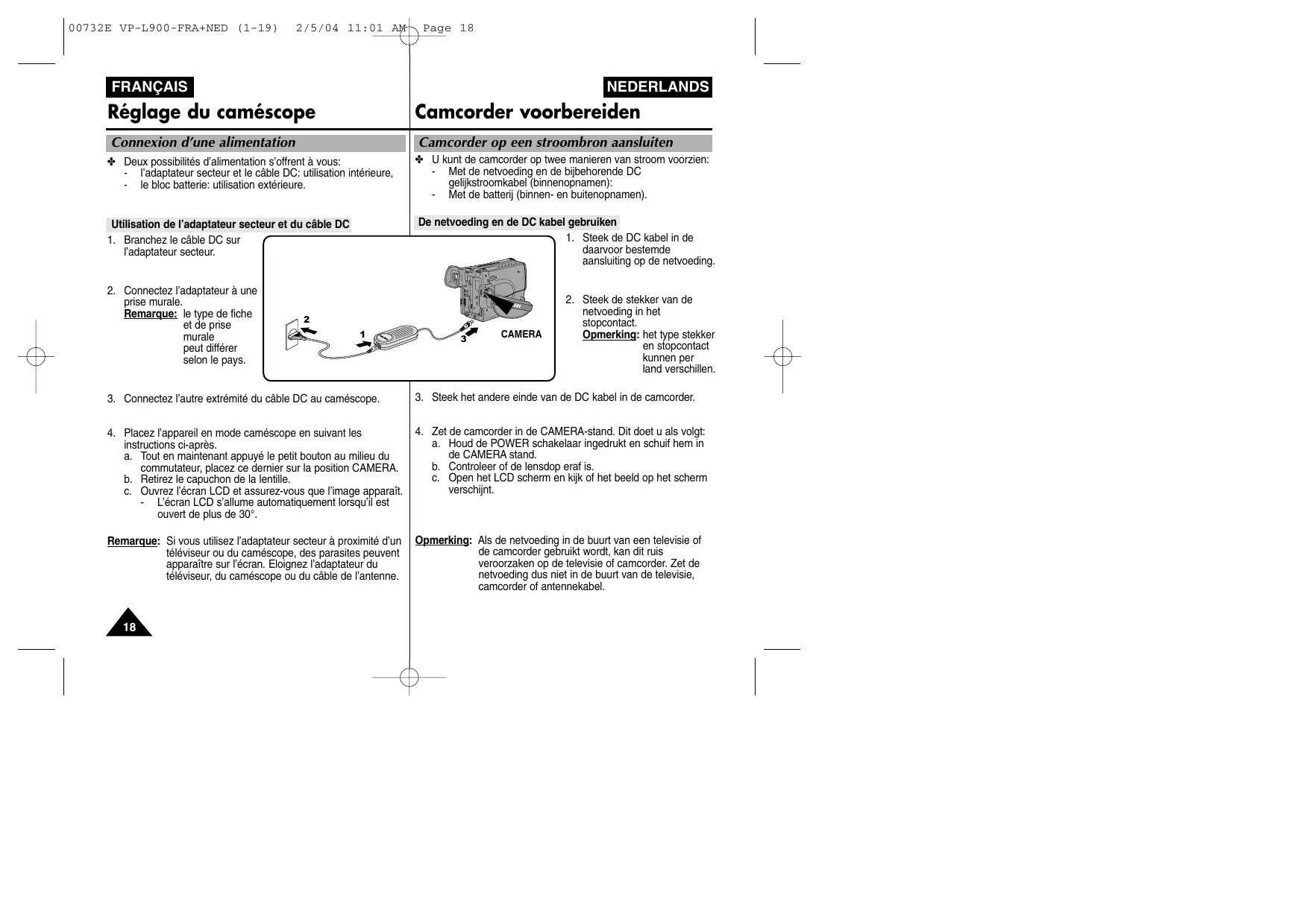 - VP-L900/L906/L907 Mode d’emploi Avant d’utiliser l’appareil, lisez attentivement ce mode d’emploi et le conservez-le à proximité pour vous y référer ultérieurement. Ce produit est conforme aux directives européennes 89/336 CEE, 73/23 CEE, 93/68 CEE. ELECTRONICS VP-L900/L906/L907 Gebruiksaanwijzing Lees voordat u uw camcorder in gebruik neemt deze gebruiksaanwijzing grondig door en bewaar hem goed. Dit product voldoet aan de eisen 89/336 CEE, 73/23 CEE, 93/68 CEE. AD68-00732E 00732E VP-L900-FRA+NED (1-19) 2/5/04 11:01 AM Page 2 FRANÇAIS NEDERLANDS Sommaire Inhoudsopgave Remarques et consignes de sécurité Belangrijke opmerkingen en veiligheidsinformatie Familiarisez-vous avec le caméscope Fonctionnalités p. 8
