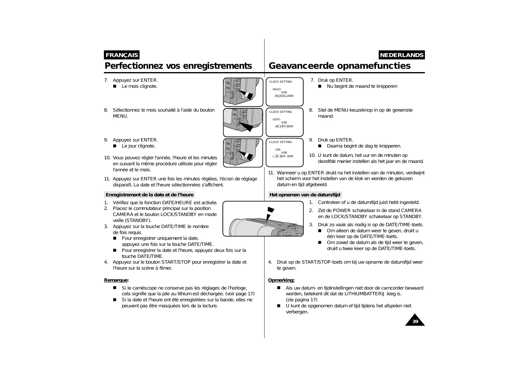 FRANÇAIS NEDERLANDS Remarques et consignes de sécurité Belangrijke opmerkingen en veiligheidsinformatie Bloc batterie De batterij ✤ Assurez-vous que le bloc batterie est chargé avant de filmer sans connexion au secteur. ✤ Pour conserver la charge de la batterie, maintenez votre caméscope éteint lorsque vous ne l’utilisez pas. ✤ En mode caméscope, si vous laissez votre appareil en mode veille pendant plus de 5~7 minutes sans vous en servir, il s’éteint automatiquement pour éviter un déchargement intempestif de la batterie. ✤ Assurez-vous que le bloc batterie est fermement maintenu en place. Ne le faites pas tomber car vous risqueriez de l’endommager. ✤ Lorsque la batterie ou la pile ne fonctionne plus, contactez votre revendeur le plus proche. Les batteries doivent être traitées en tant que déchets chimiques. Pile au lithium De lithiumbatterij
