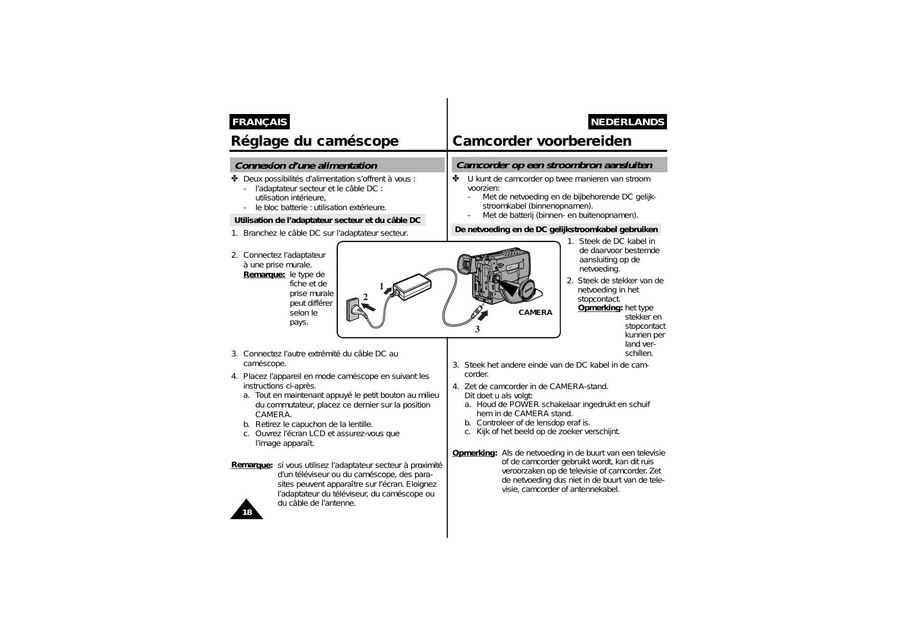 FRANÇAIS NEDERLANDS Dépannage Problemen oplossen Formation de condensation Condensvorming ✤ Un changement soudain de température peut entraîner la formation de buée à l’intérieur de l’appareil, sur la surface de la cassette ou sur les lentilles. Ce peut être le cas, lorsque vous passez d’un extérieur froid à un intérieur chaud ou d’un intérieur frais à un extérieur chaud. Dans ce cas, la bande peut coller aux têtes vidéo et être endommagée ou l'appareil risque de ne pas fonctionner correctement. Pour éviter de tels dommages, le caméscope est doté d’un capteur d'humidité. ✤ S'il y a de l'humidité dans le caméscope, “DEW ( )” s'affiche. Dans ce cas, aucune des fonctions, sauf l'éjection de la cassette, ne peut fonctionner. Ouvrez le compartiment de la cassette et laissez l’appareil dans un endroit chaud et sec pendant au moins deux heures. ✤ Effectuez la procédure ci-après lorsque la mention DEW apparaît intempestivement et que vous souhaitez néanmoins filmer. Assurez-vous que la condensation a complètement disparu. ✤ Als de camcorder vanuit een koude naar een warme plaats gaat, kan er vocht condenseren in de camcorder, op de band of op de lens. Hierbij kan de band aan de koppentrommel plakken en beschadigd raken. Ook de camcorder zelf kan hieronder te lijden hebben. De camcorder is daarom voorzien van een vochtsensor, zodat u attent kunt worden gemaakt op condensvorming en schade kunt DEW voorkomen. ✤ Wanneer er in de camcorder condensatie is opgetreden, verschijnt de indicatie DEW ( ). Als deze indicatie zichtbaar is, zijn vrijwel alle functies uitgeschakeld. Het is alleen nog mogelijk om het cassettecompartiment te openen. Haal de cassette uit de camcorder en verwijder vervolgens de batterij. Leg de camcorder minstens twee uur in een droge, warme ruimte. ✤ Als de vochtbeveiliging (DEW) onverwachts wordt ingeschakeld, en u wilt toch filmen, doet u het volgende: (Zorg ervoor dat het vocht helemaal verdwenen is.)