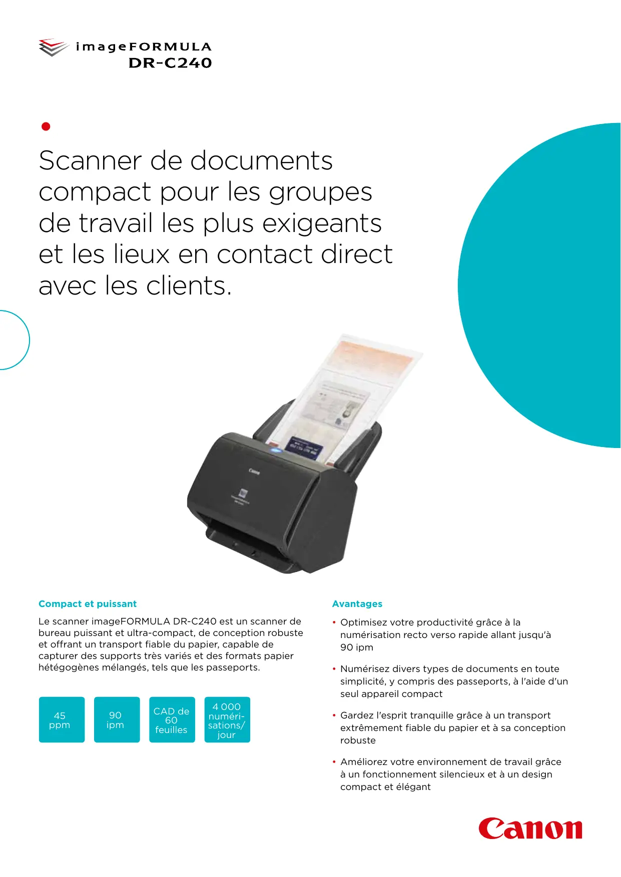 Le scanner imageFORMULA DR-C240 est un scanner de bureau puissant et ultra-compact, de conception robuste et offrant un transport fiable du papier, capable de capturer des supports très variés et des formats papier hétérogènes mélangés, tels que les passeports.