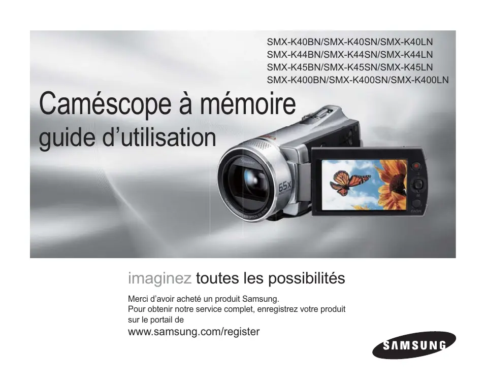 Caméscope à mémoire guide d’utilisation imaginez toutes les possibilités Merci d’avoir acheté un produit Samsung. Pour obtenir notre service complet, enregistrez votre produit sur le portail de www.samsung.com/register particularités importantes de votre caméscope à mémoire flash Écran LCD couleur haute résolution format écran large (écran TFT LCD LARGE 2,7 pouces) Le caméscope à mémoire flash Samsung dispose d’un écran large LCD 2,7 pouces de 230 pixels qui permet un affichage net et lumineux. En outre, l’action renforcée de l'optimisateur LCD qui adapte la couleur et la luminosité de l’écran aux conditions de l’éclairage ambiant permet un meilleur visionnage sous une forte lumière solaire. Codage H.264 (MPEG4 partie 10/Codage vidéo évolué) La plus récente technologie de compression vidéo, le codage H.264 utilise un niveau de compression élevé permettant d'améliorer considérablement la durée d'enregistrement sur un support de stockage particulier. Interface utilisateur simple et facile à manier Conçue pour offrir une facilité d’utilisation optimale, grâce à une forme ergonomique comprenant une disposition des touches personnalisables, correspondant à l'enregistrement et la lecture et aux fonctions fréquemment utilisées. Une interface utilisateur graphique améliorée fournit un nouveau design innovant et une grande facilité de maniement. SSD (Solid State Drive) adopted as built-in storage media (16 Go (SMX-K44 uniquement)), (32 Go (SMX-K45 uniquement)) SSD based on fl ash memory has been adopted as built-in memory for the camcorder. SSD helps the camcorder boot, read data and operate the software much faster than normal HDD (Hard Disk Drives). Also, SSD is very stable, durable and makes less noise while in operation. It is environment-friendly because low electric power is required. Fonctions conviviales La fonction conviviale EASY Q optimise votre caméscope à mémoire flash pour les conditions d’enregistrement automatique, ce qui assure les meilleures performances, même aux utilisateurs débutants.
