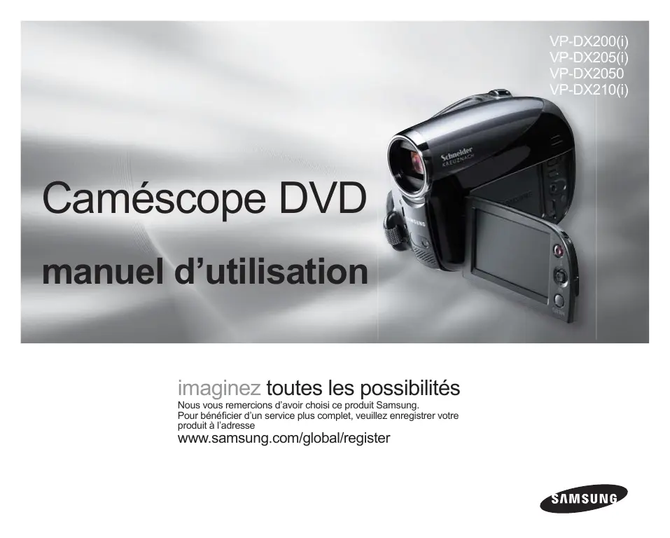 à celles d’un mini-DV, mais sur DVD. La lecture de ces DVD est un véritable jeu d’enfant (selon l’appareil de lecture utilisé). Après sa finalisation sur le caméscope, le disque est reproductible sur la plupart des lecteurs DVD (SD) et des ordinateurs. Large écran LCD 2,7 po, format 16/9e (112 000 pixels) Un large écran LCD 2,7 pouces, 16/9e présente une excellente netteté de visionnement avec une résolution améliorée. L’afficheur à cristaux liquides de 112 000 pixels pivote sur 270 degrés et offre des angles de visionnement multiples permettant de fournir des images nettes et détaillées, adaptées à la surveillance et la reproduction. Son format grand écran 16/9e facilite considérablement la prise de vue et la composition d’ images. Capture d’images à des distances imperceptibles à l’œil nu ;Zoom optique motorisé 34x (VP-DX200(i)/DX205(i)/DX2050 uniquement) ou 26x (VP-DX210(i) uniquement), intelli-zoom 42x (VP-DX200(i)/DX205(i)/ DX2050 uniquement) ou intelli-zoom 30x (VP-DX210(i) uniquement) et zoom numérique 2200x. Extrêmement performants, les objectifs grands angles de Samsung autorisent un cadrage large d’objets rapprochés sans sacrifier à la qualité de l’image. De plus, l’interpolation du zoom numérique permet de réaliser des prises de vue très rapprochées qui sont plus nettes et moins déformées qu’avec les anciens zooms numériques. Réduction de bruit avancée et stabilisateur d’image Doté de la technologie de réduction bruit 3 D développée par Samsung, ce caméscope peut supprimer le bruit vidéo tout en préservant la bordure et la trame de l’image originale. Il est également équipé d’une puissante technologie de stabilisation d’image anti-vibration qui neutralise efficacement l’effet du moindre mouvement de la main pour produire un enregistrement clair. ii_ Français