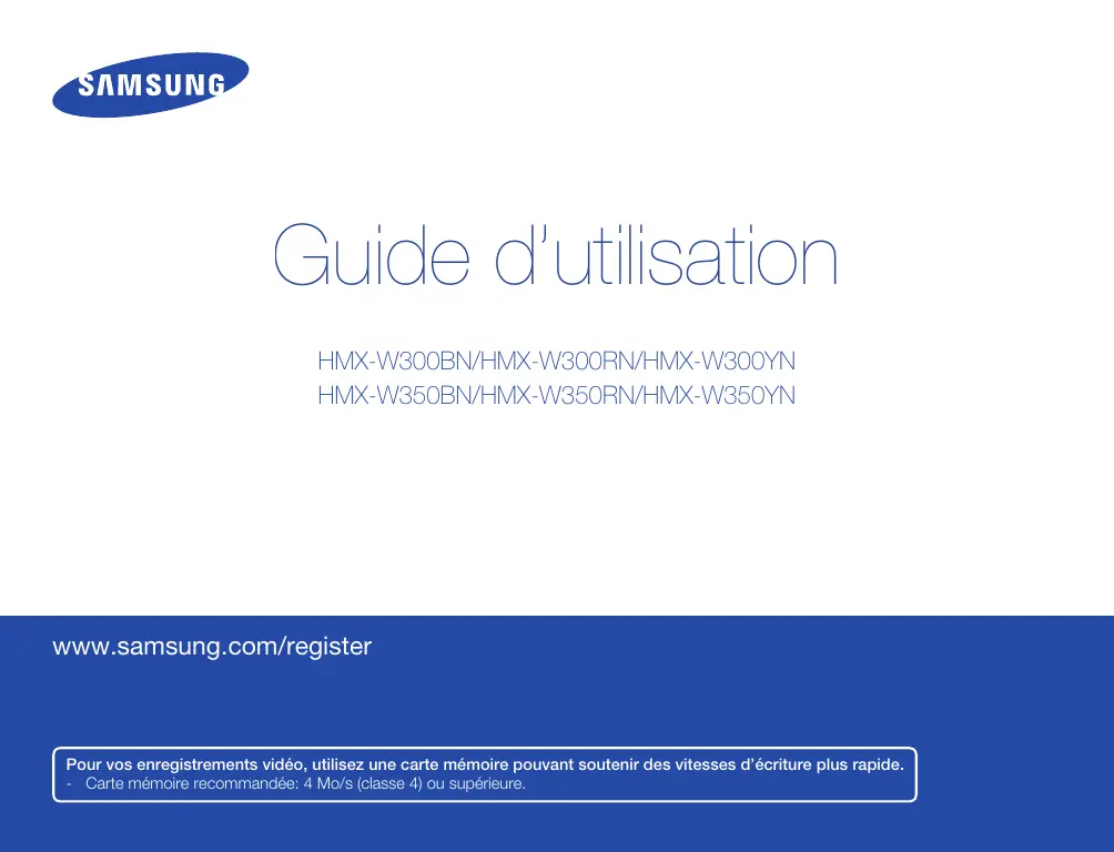www.samsung.com/register Pour vos enregistrements vidéo, utilisez une carte mémoire pouvant soutenir des vitesses d’écriture plus rapide. - Carte mémoire recommandée: 4 Mo/s (classe 4) ou supérieure. Pour préserver l’étanchéité et la résistance à la poussière et aux chocs