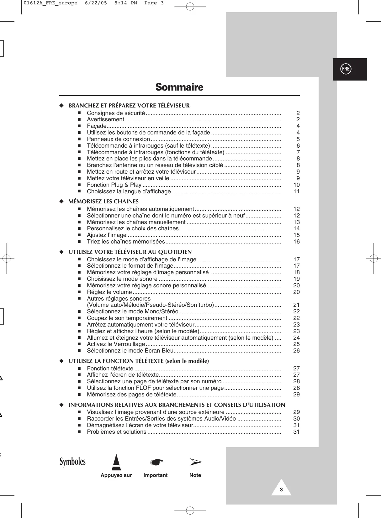 01612A_FRE_europe 6/22/05 5:14 PM Page 3 FRE Sommaire ◆ BRANCHEZ ET PRÉPAREZ VOTRE TÉLÉVISEUR Consignes de sécurité ................................................................................... Avertissement................................................................................................ Façade........................................................................................................... Utilisez les boutons de commande de la façade ........................................... Panneaux de connexion ................................................................................ Télécommande à infrarouges (sauf le télétexte) ........................................... Télécommande à infrarouges (fonctions du télétexte) .................................. Mettez en place les piles dans la télécommande .......................................... Branchez l’antenne ou un réseau de télévision câblé ................................... Mettez en route et arrêtez votre téléviseur .................................................... Mettez votre téléviseur en veille .................................................................... Fonction Plug & Play ..................................................................................... Choisissez la langue d’affichage ...................................................................