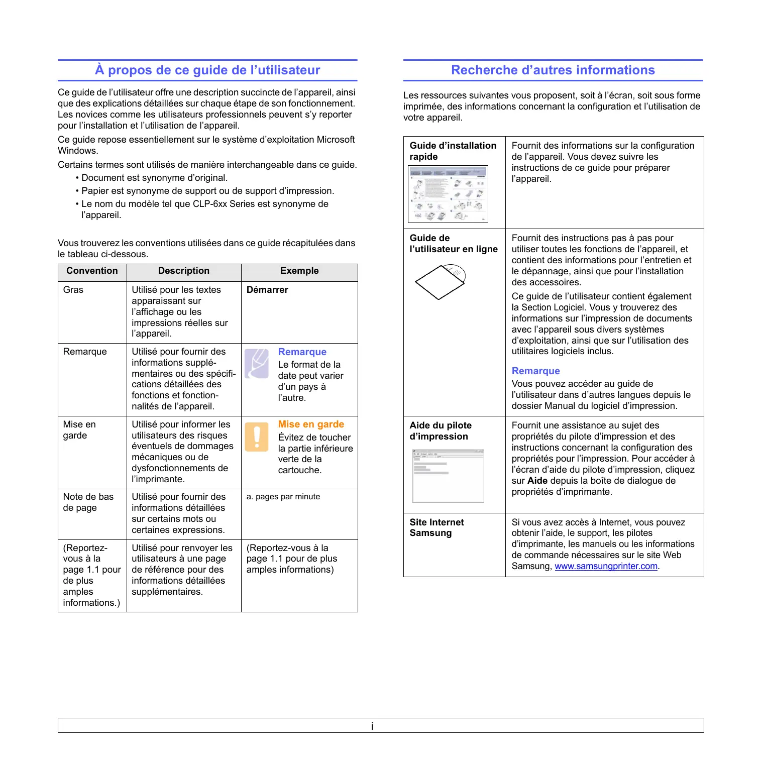 - Le nom du modèle tel que CLP-6xx Series est synonyme de l’appareil. Les ressources suivantes vous proposent, soit à l’écran, soit sous forme imprimée, des informations concernant la configuration et l’utilisation de votre appareil. Vous trouverez les conventions utilisées dans ce guide récapitulées dans le tableau ci-dessous. Convention Description Fournit des informations sur la configuration de l’appareil. Vous devez suivre les instructions de ce guide pour préparer l’appareil. Guide de l’utilisateur en ligne Fournit des instructions pas à pas pour utiliser toutes les fonctions de l’appareil, et contient des informations pour l’entretien et le dépannage, ainsi que pour l’installation des accessoires. Ce guide de l’utilisateur contient également la Section Logiciel. Vous y trouverez des informations sur l’impression de documents avec l’appareil sous divers systèmes d’exploitation, ainsi que sur l’utilisation des utilitaires logiciels inclus. Exemple Gras Utilisé pour les textes apparaissant sur l’affichage ou les impressions réelles sur l’appareil. Remarque Utilisé pour fournir des informations supplémentaires ou des spécifications détaillées des fonctions et fonctionnalités de l’appareil. Remarque Mise en garde Utilisé pour informer les utilisateurs des risques éventuels de dommages mécaniques ou de dysfonctionnements de l’imprimante. Mise en garde Note de bas de page Utilisé pour fournir des informations détaillées sur certains mots ou certaines expressions. a. pages par minute Utilisé pour renvoyer les utilisateurs à une page de référence pour des informations détaillées supplémentaires. (Reportez-vous à la page 1.1 pour de plus amples informations) (Reportezvous à la page 1.1 pour de plus amples informations.) Guide d’installation rapide Démarrer Le format de la date peut varier d’un pays à l’autre. Remarque Vous pouvez accéder au guide de l’utilisateur dans d’autres langues depuis le dossier Manual du logiciel d’impression. Évitez de toucher la partie inférieure verte de la cartouche.