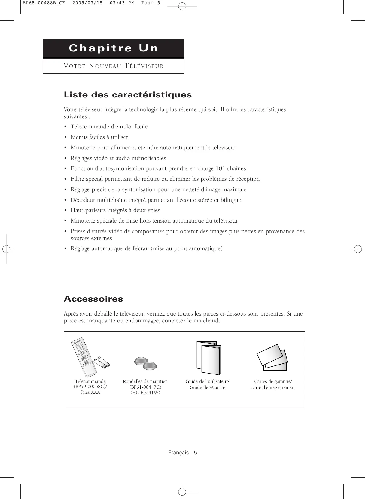- Réglage automatique de l’écran (mise au point automatique) Accessoires Après avoir déballé le téléviseur, vérifiez que toutes les pièces ci-dessous sont présentes. Si une pièce est manquante ou endommagée, contactez le marchand. Télécommande (BP59-00058C)/ Piles AAA Rondelles de maintien (BP61-00447C) (HC-P5241W) Guide de l’utilisateur/ Guide de sécurité Français - 5 Cartes de garantie/ Carte d’enregistrement BP68-00488B_CF 2005/03/15 03:43 PM Page 6