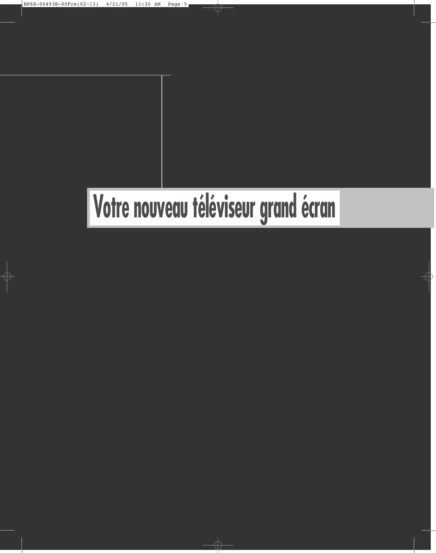 - BP68-00493B-00Fre(cover) 4/14/05 7:02 PM Page 3 Guide de l’utilisateur HL-R4264W HL-R4664W HL-R5064W HL-R5664W HL-R6164W Cet appareil est conforme aux exigences relatives aux appareils numériques de classe B. Enregistrez vos produits Samsung en vous connectant sur : www.samsung.com/global/register BP68-00493B-00Fre(02~13) 4/21/05 11:30 AM Page 2 Table des matières Votre nouveau téléviseur grand écran p. 6