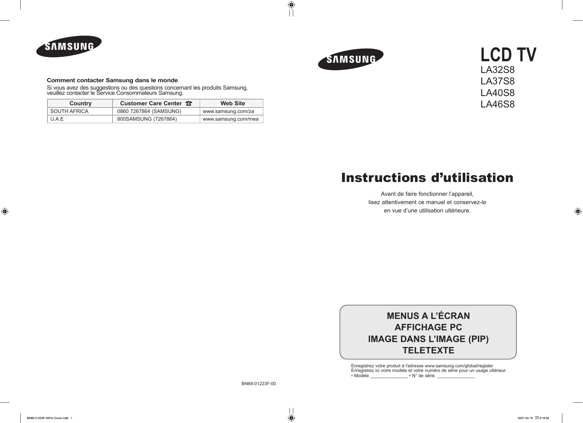 - Modèle _______________ ▪ N° de série. _______________ BN68-01223F-00 BN68-01223F-00Fre-Cover.indd 1 2007-03-19 6:19:26 Précautions à prendre lors de l’affichage d’une image fixe Une image fixe peut causer des dommages irrémédiables à l’écran du téléviseur.