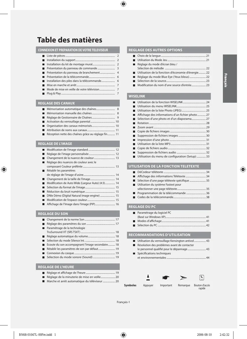 Changement de la norme Son ............................................... 17 Réglage des paramètres du son ............................................ 17 Paramétrage de la technologie TruSurround XT (SRS TSXT) ..................................................... 18 Réglage automatique du volume.......................................... 18 Sélection du mode Silence Int. .............................................. 18 Ecoute du son accompagnant l’image secondaire........... 18 Rétablir les paramètres de son par défaut. ......................... 19 Connexion du casque. .............................................................. 19 Sélection du mode sonore (Sound) .................................. 19 Français Liste de pièces ................................................................................ Installation du support ............................................................. Installation du kit de montage mural................................... Présentation du panneau de commande ............................ Présentation du panneau de branchement ........................ Présentation de la télécommande .......................................... Installation des piles dans la télécommande...................... Mise en marche et arrêt .............................................................. Mode de mise en veille de votre télévision ......................... Plug & Play .......................................................................................