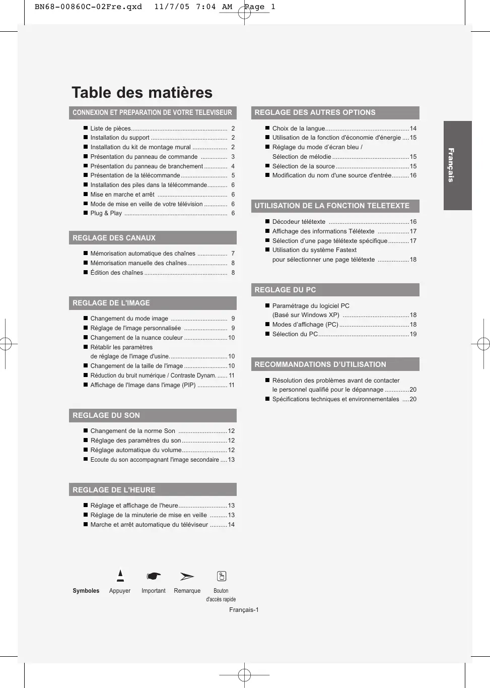 Réglage et affichage de l'heure............................13 Réglage de la minuterie de mise en veille ..........13 Marche et arrêt automatique du téléviseur ..........14 Symboles Appuyer Important Remarque Bouton d'accès rapide Français-1 Résolution des problèmes avant de contacter le personnel qualifié pour le dépannage ..............20 Spécifications techniques et environnementales ....20 Français Liste de pièces.......................................................... Installation du support .............................................. Installation du kit de montage mural .................... Présentation du panneau de commande ................ Présentation du panneau de branchement .............. Présentation de la télécommande ............................ Installation des piles dans la télécommande............ Mise en marche et arrêt .......................................... Mode de mise en veille de votre télévision .............. Plug & Play ..............................................................