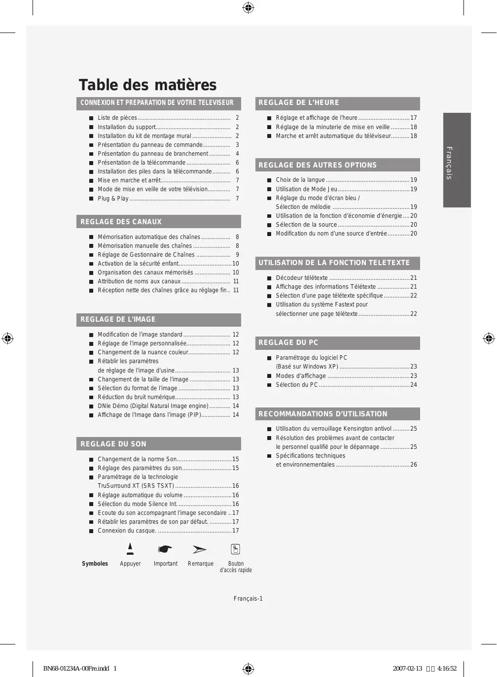 Français- BN68-01234A-00Fre.indd 6 2007-02-13 4:16:58 Mise en marche et arrêt Le câble relié au secteur est fixé à l’arrière du téléviseur/moniteur.