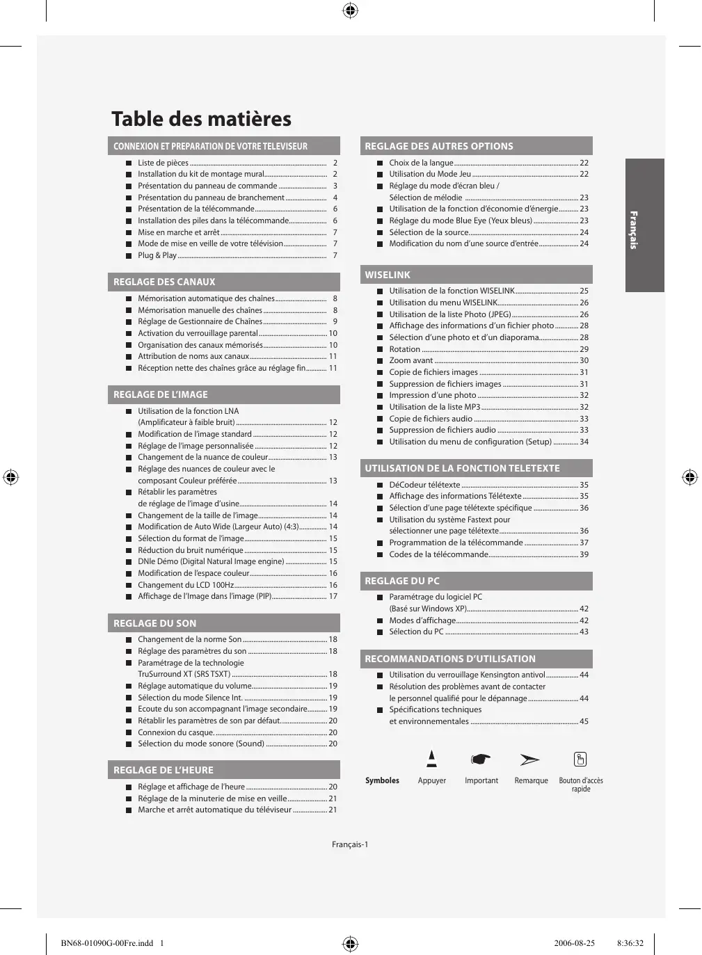Choix de la langue ..................................................................... 22 Utilisation du Mode Jeu ........................................................... 22 Réglage du mode d’écran bleu / Sélection de mélodie ............................................................... 23 Utilisation de la fonction d’économie d’énergie ........... 23 Réglage du mode Blue Eye (Yeux bleus) ......................... 23 Sélection de la source............................................................. 24 Modification du nom d’une source d’entrée ...................... 24 Français Liste de pièces ................................................................................ Installation du kit de montage mural................................... Présentation du panneau de commande ............................ Présentation du panneau de branchement ........................ Présentation de la télécommande .......................................... Installation des piles dans la télécommande...................... Mise en marche et arrêt .............................................................. Mode de mise en veille de votre télévision ......................... Plug & Play ....................................................................................... WISELINK Utilisation de la fonction WISELINK ................................... 25 Utilisation du menu WISELINK............................................. 26 Utilisation de la liste Photo (JPEG) ..................................... 26 Affichage des informations d’un fichier photo ............. 28 Sélection d’une photo et d’un diaporama...................... 28 Rotation ....................................................................................... 29 Zoom avant ................................................................................ 30 Copie de fichiers images ....................................................... 31 Suppression de fichiers images .......................................... 31 Impression d’une photo ........................................................ 32 Utilisation de la liste MP3 ...................................................... 32 Copie de fichiers audio .......................................................... 33 Suppression de fichiers audio ............................................. 33 Utilisation du menu de configuration (Setup) .............. 34 Mémorisation automatique des chaînes .............................. 8 Mémorisation manuelle des chaînes ..................................... 8 Réglage de Gestionnaire de Chaînes ..................................... 9 Activation du verrouillage parental ...................................... 10 Organisation des canaux mémorisés ..................................... 10 Attribution de noms aux canaux ............................................. 11 Réception nette des chaînes grâce au réglage fin ............ 11