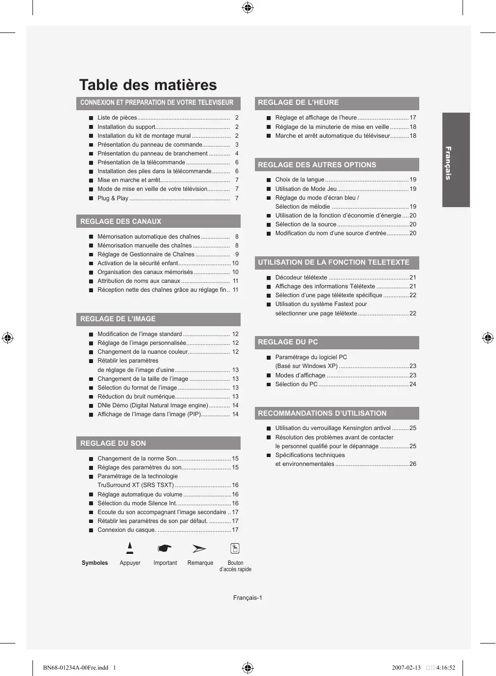 Changement de la norme Son................................. 15 Réglage des paramètres du son.............................. 15 Paramétrage de la technologie TruSurround XT (SRS TSXT).................................. 16 Réglage automatique du volume............................. 16 Sélection du mode Silence Int................................. 16 Ecoute du son accompagnant l’image secondaire... 17 Rétablir les paramètres de son par défaut............... 17 Connexion du casque............................................. 17 Symboles Choix de la langue.................................................. 19 Utilisation de Mode Jeu........................................... 19 Réglage du mode d’écran bleu / Sélection de mélodie ............................................. 19 Utilisation de la fonction d’économie d’énergie..... 20 Sélection de la source........................................... 20 Modification du nom d’une source d’entrée.............. 20 Français Liste de pièces.......................................................... Installation du support............................................... Installation du kit de montage mural........................ Présentation du panneau de commande.................. Présentation du panneau de branchement.............. Présentation de la télécommande............................ Installation des piles dans la télécommande............ Mise en marche et arrêt............................................ Mode de mise en veille de votre télévision.............. Plug & Play............................................................... Utilisation du verrouillage Kensington antivol........... 25 Résolution des problèmes avant de contacter le personnel qualifié pour le dépannage.................. 25 Spécifications techniques et environnementales............................................ 26 Bouton d’accès rapide Français- BN68-01234A-00Fre.indd 1 2007-02-13 4:16:52 Liste de pièces Veuillez vous assurer que les composants suivants sont bien inclus avec votre téléviseur LCD. Le cas échéant, contactez votre revendeur. M4 X L16 Télécommande et batteries (AAA x 2) Instructions d’utilisation Cordon d’alimentation Panneau inférieur Carte de garantie Vis pour le socle X 4 Carte réseau de service Socle Guide de sécurité Chiffon de nettoyage Cartes d’enregistrement Carte de garantie / Carte réseau de service / Guide de sécurité / Cartes d’enregistrement (N’est pas disponible dans toutes les agences). Selon le modèle, il se peut que le socle et les vis ne soient pas inclus.