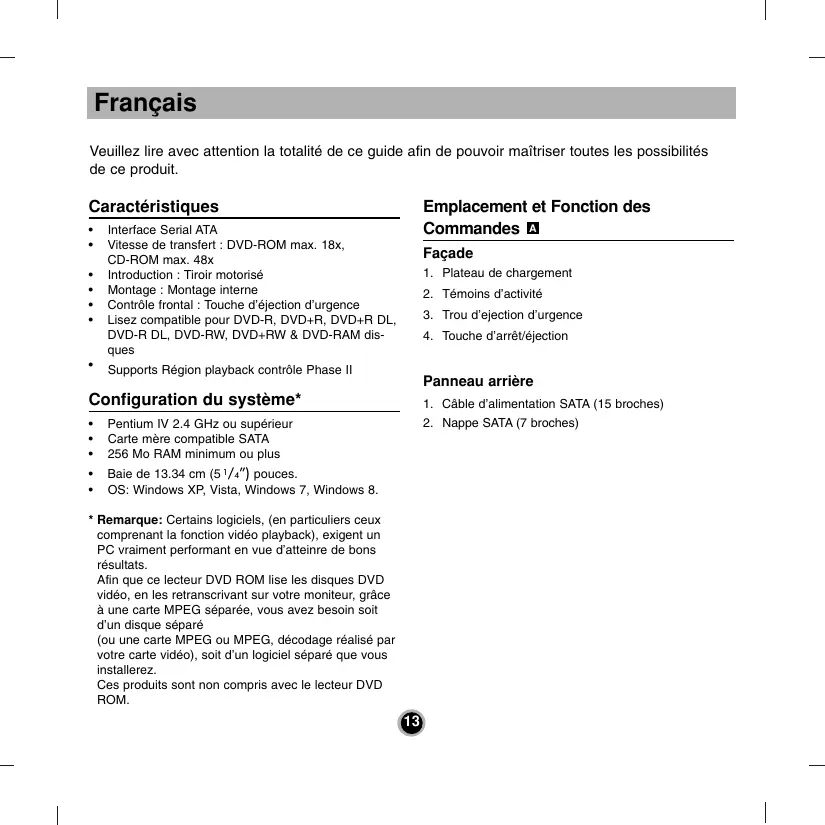 | Formats supportés | DVD-ROM, DVD-R, DVD-RW, CD-ROM, CD-R, CD-RW |