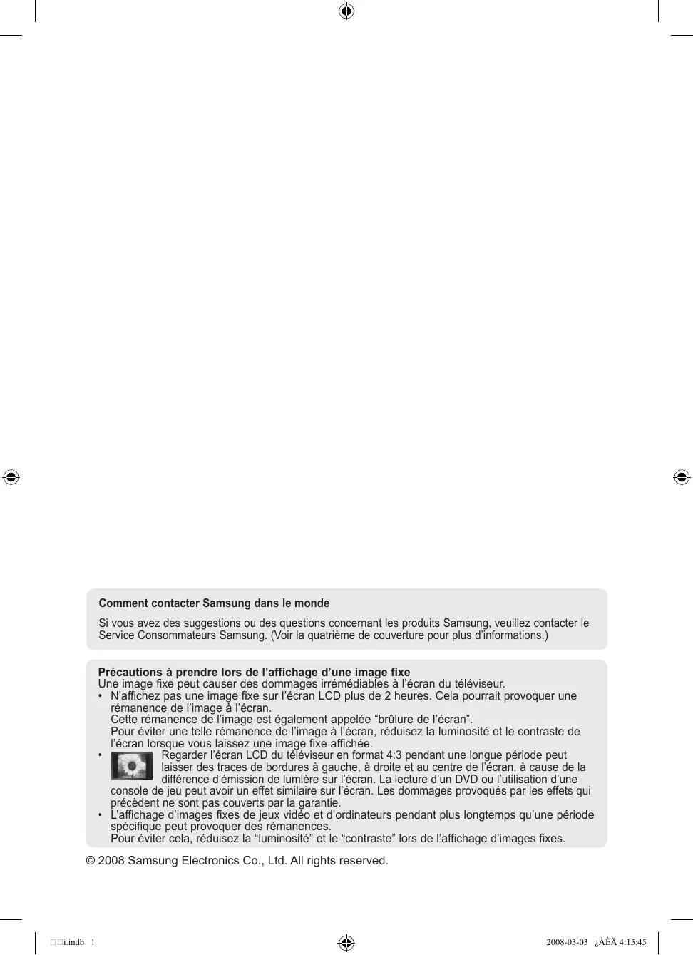 • L’affichage d’images fixes de jeux vidéo et d’ordinateurs pendant plus longtemps qu’une période spécifique peut provoquer des rémanences. Pour éviter cela, réduisez la “luminosité” et le “contraste” lors de l’affichage d’images fixes. © 2008 Samsung Electronics Co., Ltd. All rights reserved. i.indb 1 2008-03-03 ¿ÀÈÄ 4:15:45