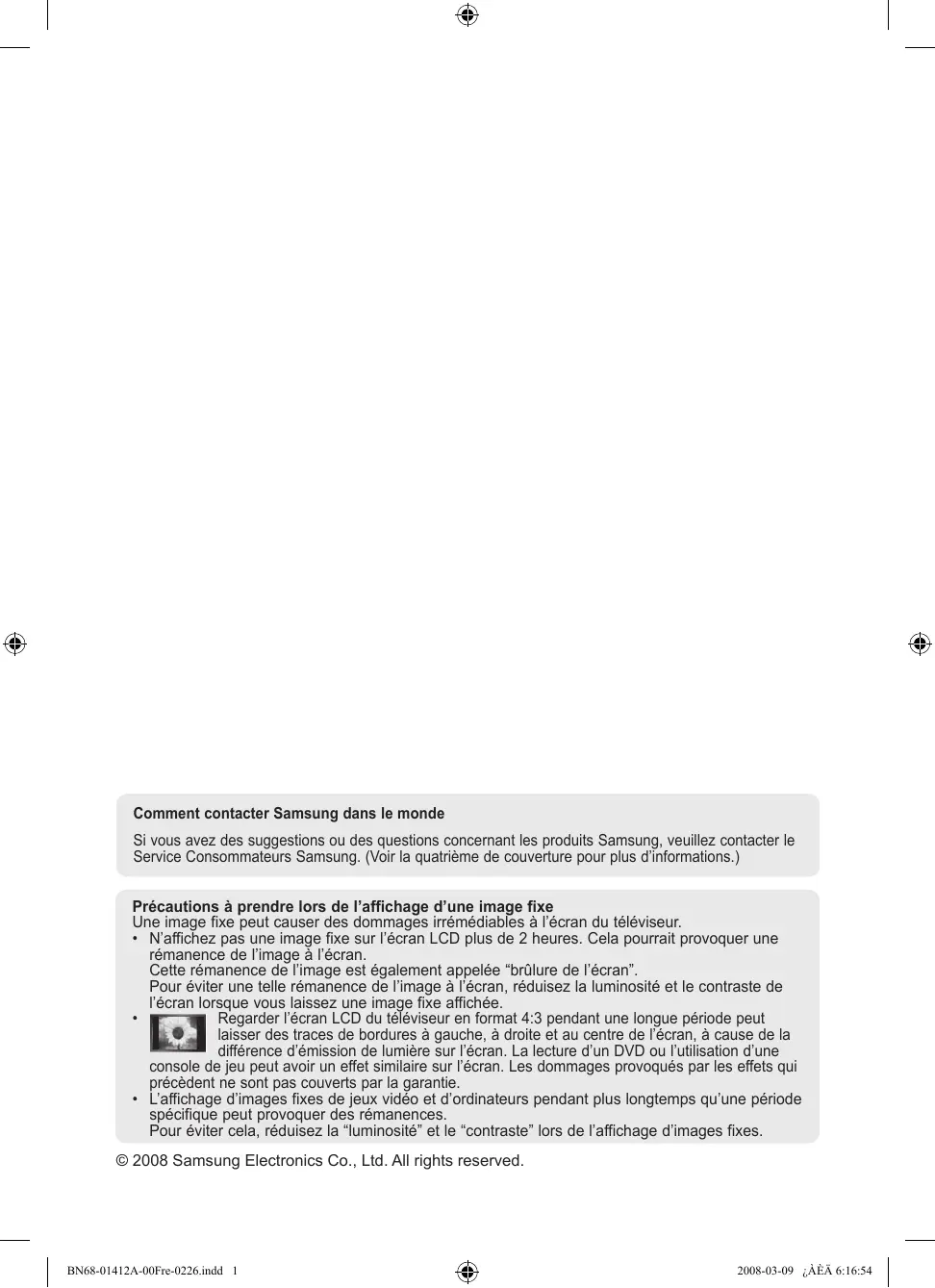- L’affichage d’images fixes de jeux vidéo et d’ordinateurs pendant plus longtemps qu’une période spécifique peut provoquer des rémanences. Pour éviter cela, réduisez la “luminosité” et le “contraste” lors de l’affichage d’images fixes. © 2008 Samsung Electronics Co., Ltd. All rights reserved. BN68-01412A-00Fre-0226.indd 1 2008-03-09 ¿ÀÈÄ 6:16:54