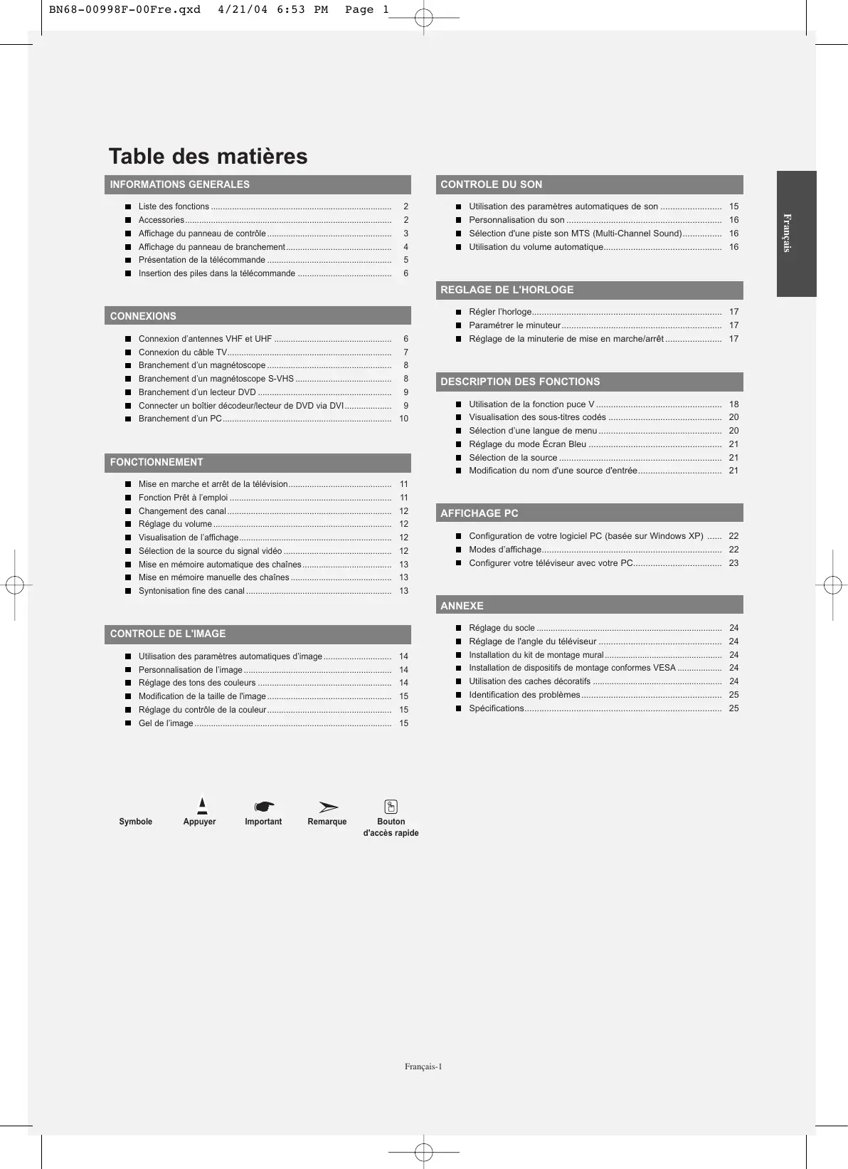 Bouton d'accès rapide Français-1 Réglage du socle ............................................................................... Réglage de l'angle du téléviseur .................................................. Installation du kit de montage mural .................................................. Installation de dispositifs de montage conformes VESA ................... Utilisation des caches décoratifs ....................................................... Identification des problèmes......................................................... Spécifications................................................................................